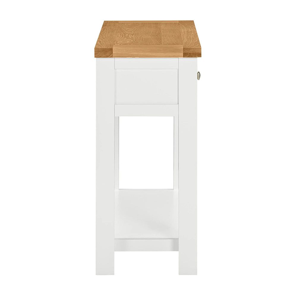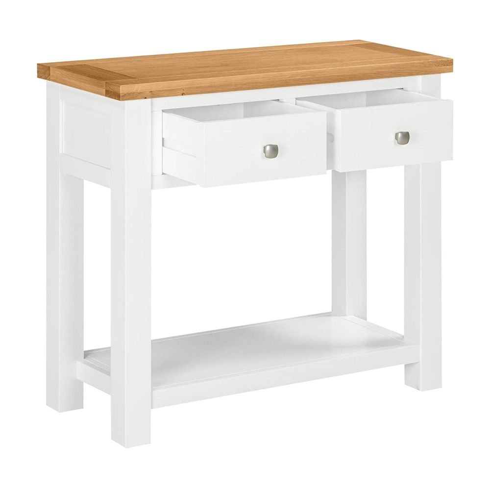 With its clean lines and elegant proportions, this painted console table brings understated style to hallways or living spaces. Two drawers provide useful storage for keys and everyday items, while the natural oak top adds warmth and texture to the design and the low shelf is great for further storage or display items.