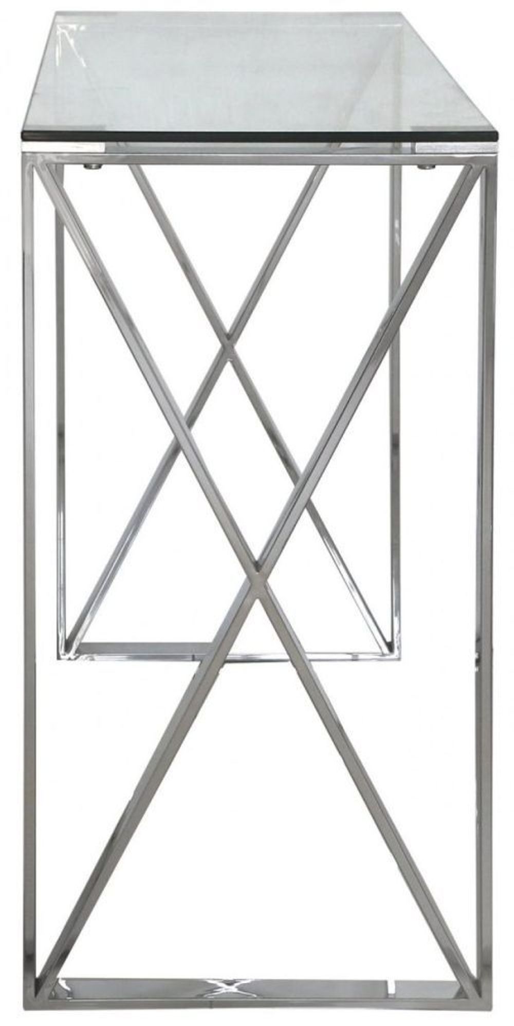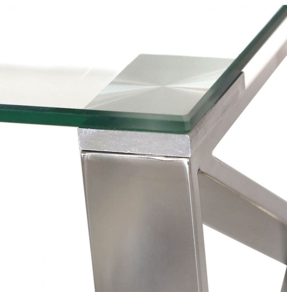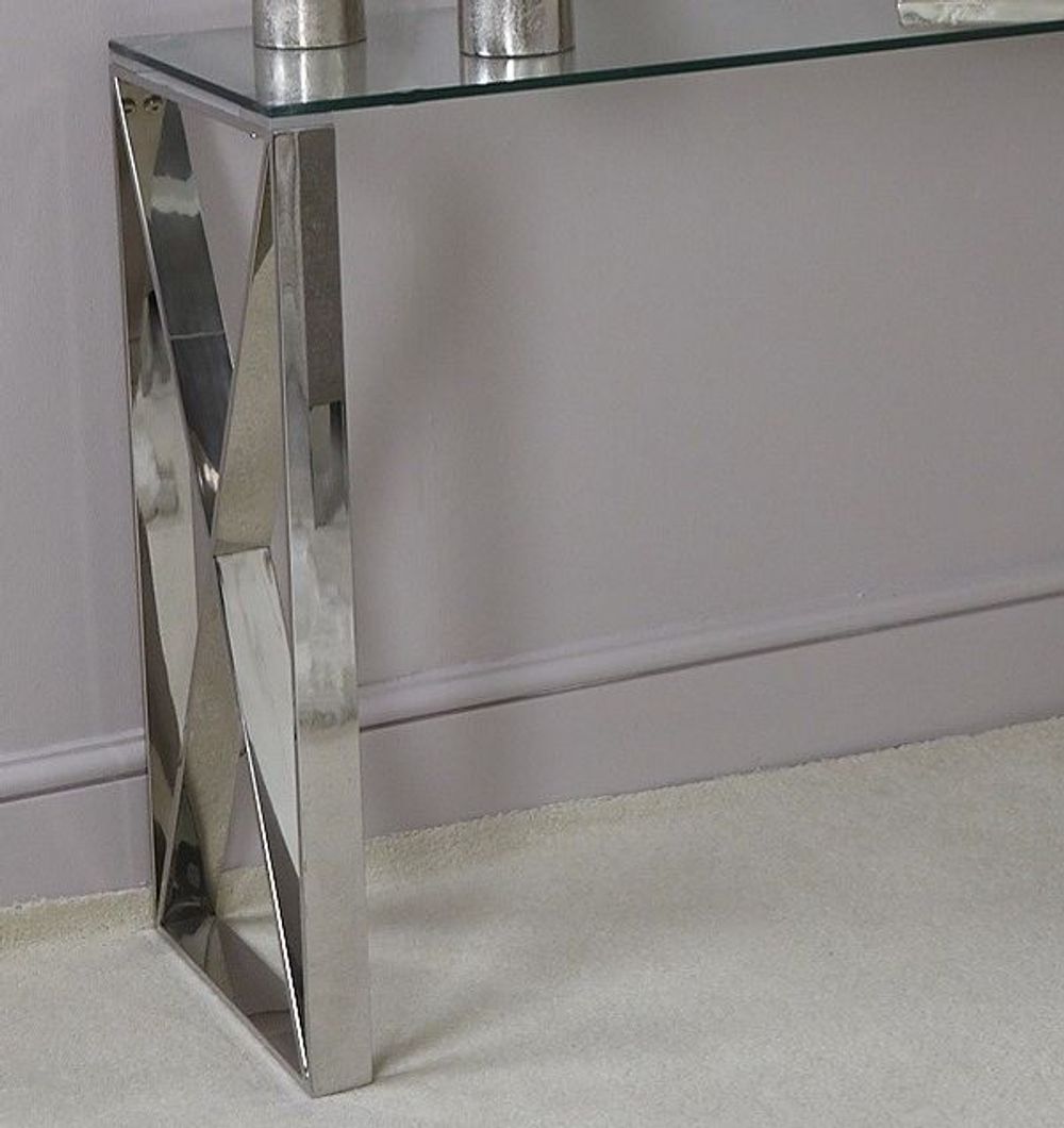 Item Code: MF129-00-GLS-CL Apex stainless steel console table. Crafted in a steel frame, it showcases a silver hue with a rectangular design on the table ends finished with a tempered clear glass table top. Bring a glamorous touch to your entryway with the Zenith stainless steel console table. GENERAL CARE INSTRUCTION This product care will guide you on the best way to care for your product to maximize their guaranteed life. Protect from direct sunlight. The location of your product can affect its durability, thus placing it too close to high-temperature appliances can increase the risk of scorching damage or discoloration and placing the item where it can touch external walls can create moisture build-up. Sharp objects and even the claws of your pets can tear, scratch or break the product. * Periodically wipe clean with a soft dry cloth and/or non-abrasive cleaner. * Do not rub or scrub the surface when cleaning. * Take precautions in using vacuums and use low suction as much as possible to maintain product integrity. * Do not strike the material with hard or pointed items. * Do not use abrasive and harsh cleaning products. * Do not sit or stand on products otherwise indicated. * If liquid spills do occur, wipe or blot with dry clean cloth as soon as possible. * Avoid direct and continuous exposure to sunlight. * Care must be taken in using coloured cleaning materials as it may transfer or stain products. * Always follow cleaning product guide/manual on any cleaning product used. * Dragging, pulling, and dropping any product is not recommended. * Do not place items with extreme temperature on the product as it may cause brittleness. DISCLAIMER GLASS items will be similar, but never identical. Slight imperfections in the form of air bubbles, hand tool marks, pattern and colour irregularities reveal that a skilled human hand produced the glassware rather than a mass producing machine. Shapes, sizes and colours may vary from piece to piece as this is the nature of the product. METAL items are most often hand crafted or hand finished. Colour can vary and slight imperfections are normal for metal crafted by hand. We feel this adds character and authenticity to these items.