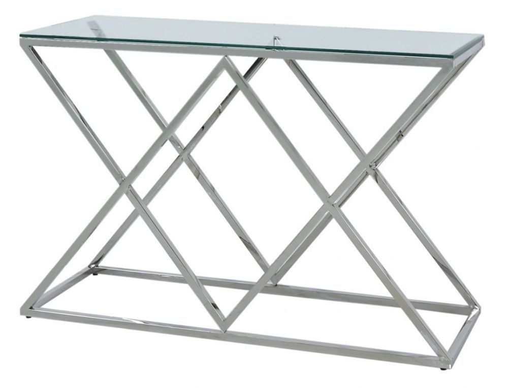 Item Code: MF237-00-GLS-SS This elegantly designed console table will be a wonderful addition to any room. Constructed with glass and metal in silver finish, it brings a sophisticated charm to your space. Its angular chrome legs provide sturdy support and the table does not include any storage. A perfect addition for contemporary homes that can be used as a small side table or as a statement item in your living space.