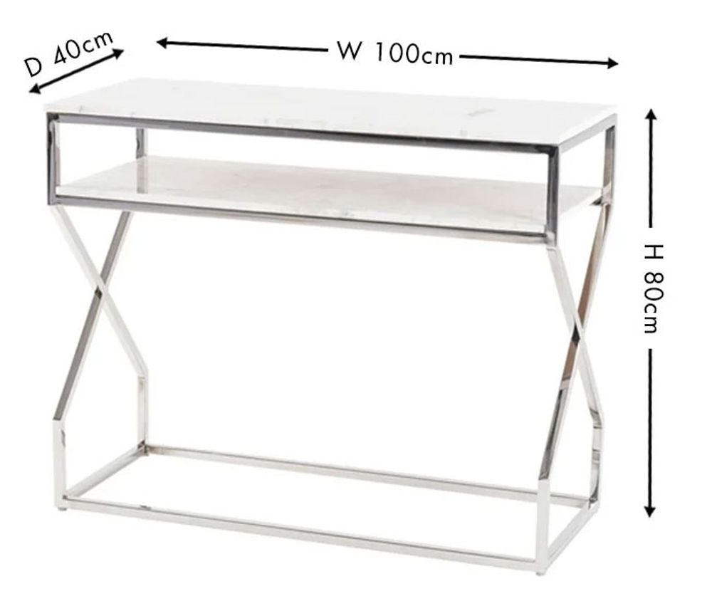 Item Code: AI-2843OT Top : Marble Wonder white (White marble thickness: 15mm) Frame : Stainless SteelCrossroad Console Table - White Marble Top With Stainless Steel Chrome Base brings an art deco design and mid-century flair to your home office or living room. The square table features steel cross legs & a marble table top which gives the design an opulent and elegant look. This timeless table will complement an array of home decor styles, from retro to modern and glam. This piece adds a luxurious vibe to both modern and traditional arrangements. The table is a functional base for vases with fresh flowers, decor items like candles or trays if set next to the sofa or for books and magazines in a reading corner.