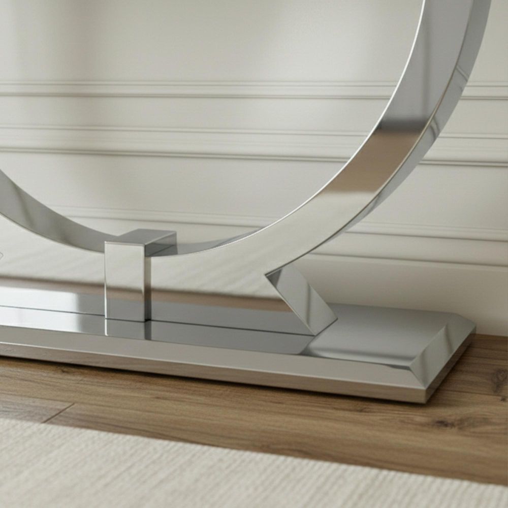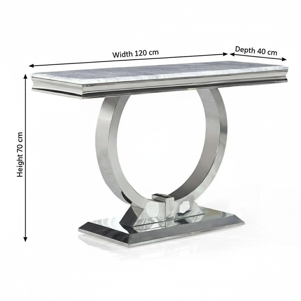 Make a striking first impression with the Glacier Grey Marble and Chrome Console Table. Designed to grace entryways, hallways, or behind-sofa setups, this sleek piece features a rectangular grey marble top and a polished chrome base, delivering clean lines and high-end character.