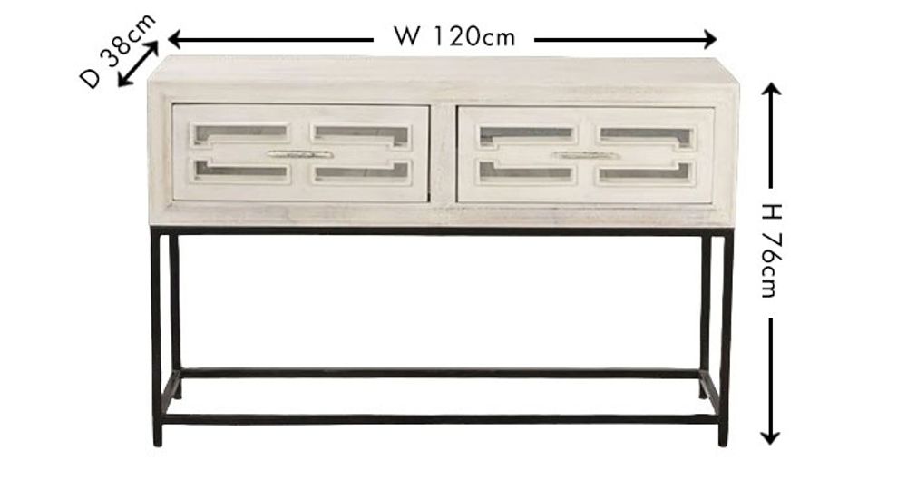 Item Code: ABW-006-White-AP This stylish 2 drawer console table is perfect for adding a touch of modern sophistication to any interior. Expertly crafted from mango wood, the distressed white wash finish adds a stylish, understated look, while the integrated storage, mirrored detail, and geometric lines offer a chic touch. Perfect for a hallway, bedroom, or living space.