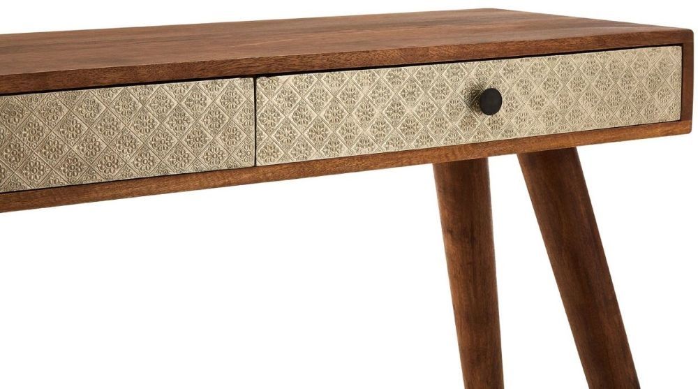 Item Code: 5501084 A retro feature for the modern home, the Boho console table, with 2 drawers, accentuates a chic look while providing a surface space to display accent pieces. Made from mango wood, the frame and slanted legs ensure durability over time, while the natural grain finish presents the table with a touch of warmth. The 2 equal sized drawers provide plenty of space for keeping magazines, menus, letters, loose change and keys safely stored and close to hand. A decorative gold facade on the drawers further accentuate the vintage charm of the table. Perfect for displaying decorative items, photos, flowers, plants or lamps on, the console table will provide function and fashion in your home. This item is handcrafted so please expect slight variations to the finish.