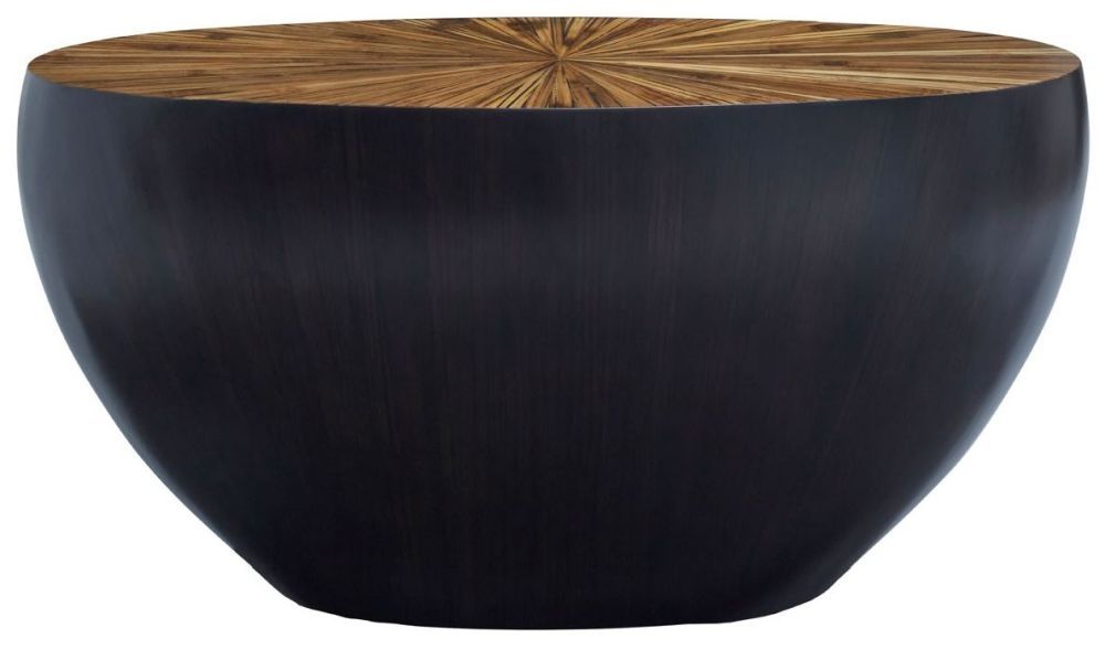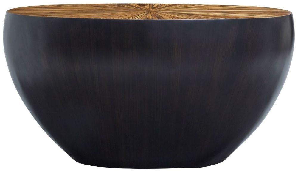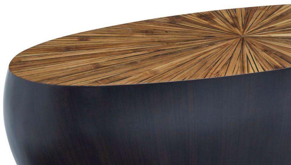 Item Code: 5527561 Add a touch of elegance to the living room with this console table in natural warmth, grain and texture. Skilfully handcrafted from renewable rubberwood, this console table features a smooth, rounded design. The minimalist, polyurethane finish base is contrasted with ebony bamboo top in a stunning starburst pattern.