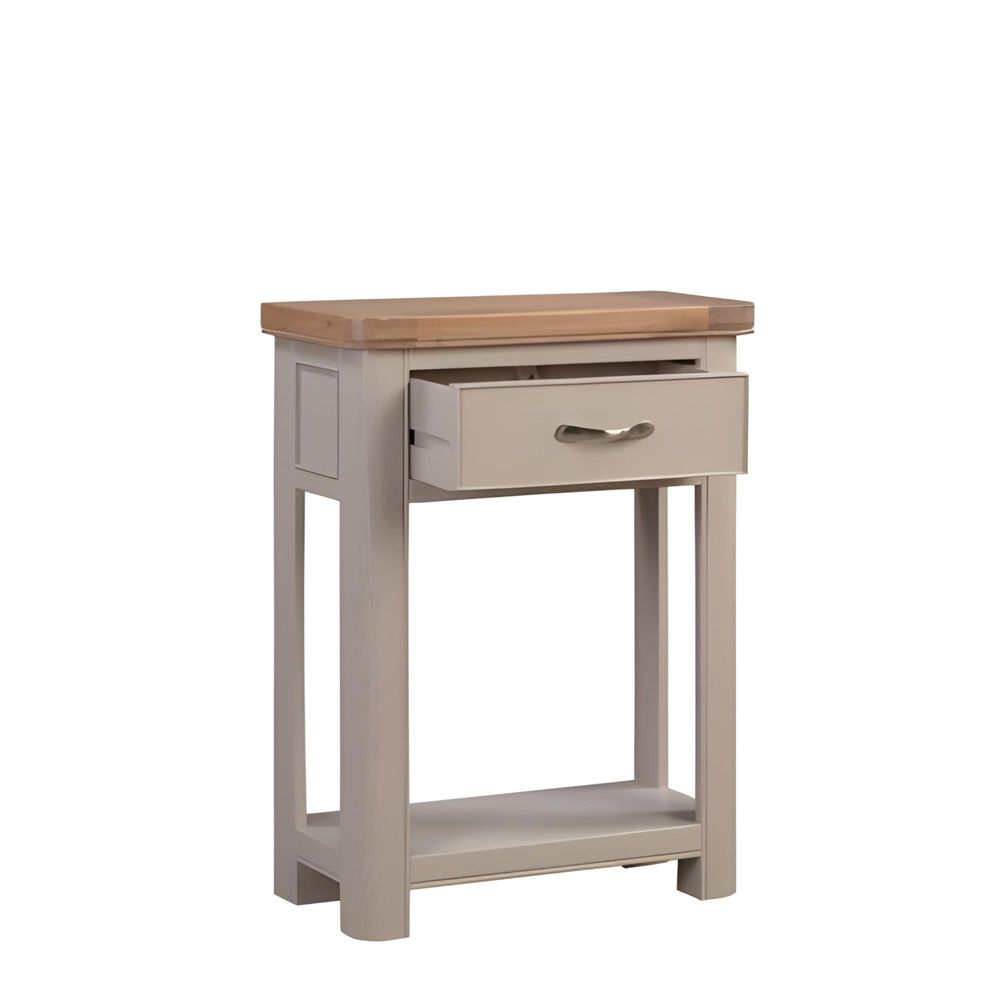 Item Code: 84-14 The Clarion Painted Small Console Table is manufactured in oak, the base is painted in a putty grey and the top has a grey wash. The range is characterized by rounded corners, traditional moulding and contemporary stainless steel handles. The console has one drawer and fixed shelf below.
