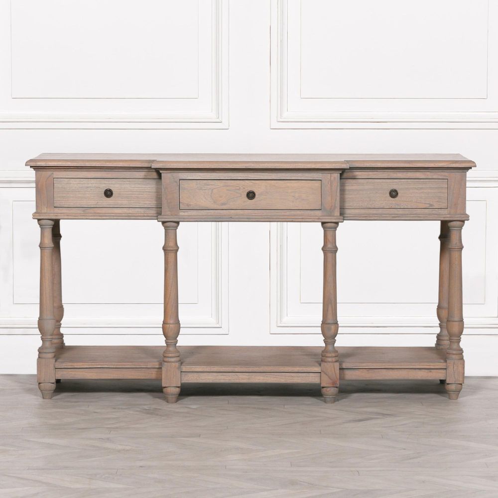 Item Code: WFA387 This stylish console table is perfect for any decorative area! Crafted with white cedar, this breakfront table features three drawers for storage and organization. An attractive addition to any home, this piece is sure to impress with its rustic charm.