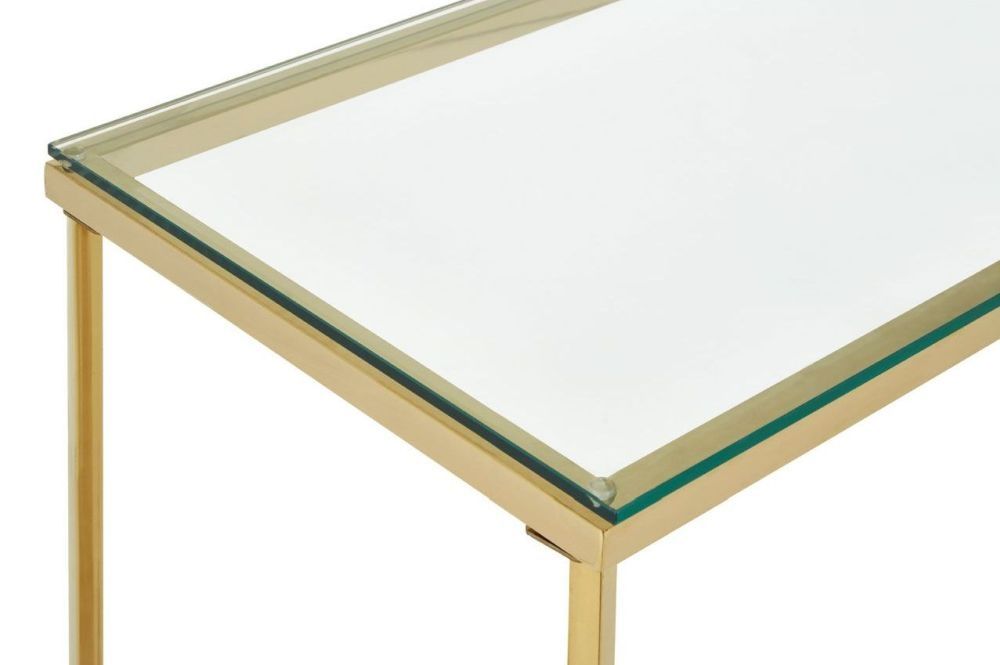 Item Code: 5502570 The contemporary Allure console table combines sumptuous gold and clear tones.This console table makes a sophisticate impression thanks to its minimal-style frame, with an intersecting base for a subtle design flourish. The frame is finished in gold for a luxurious look and is reflective. The gold creates the perfect partner for the sleek clear tempered glass top. Pair it with luxe furniture.