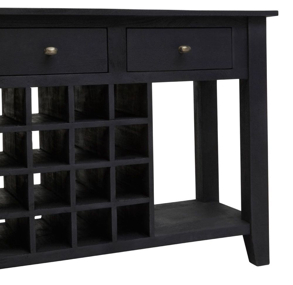 Item Code: 5528477 The Fusion console table has three drawers and twenty bottle of wine storage and is made from black mango wood.The Fusion console table is a wine lovers dream. A dramatic black mango wood frame features three drawers at the top, and space to fit 20 bottles of your finest wine.