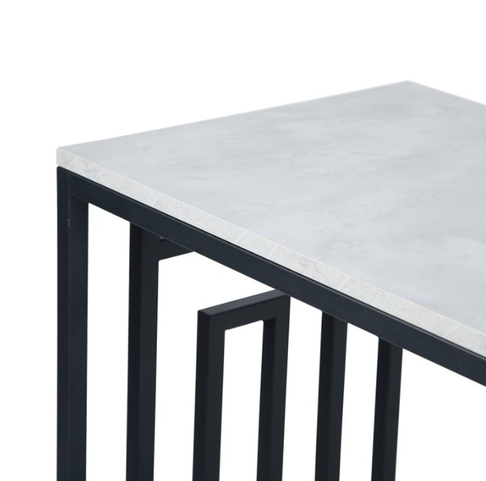 Item Code: MF325-00-BLGY Add a crisp, modern feel to any living area with the Devon console table. It features a black metal frame with Grecian inspired design on the side panels, with grey wooden, faux concrete finish top.
