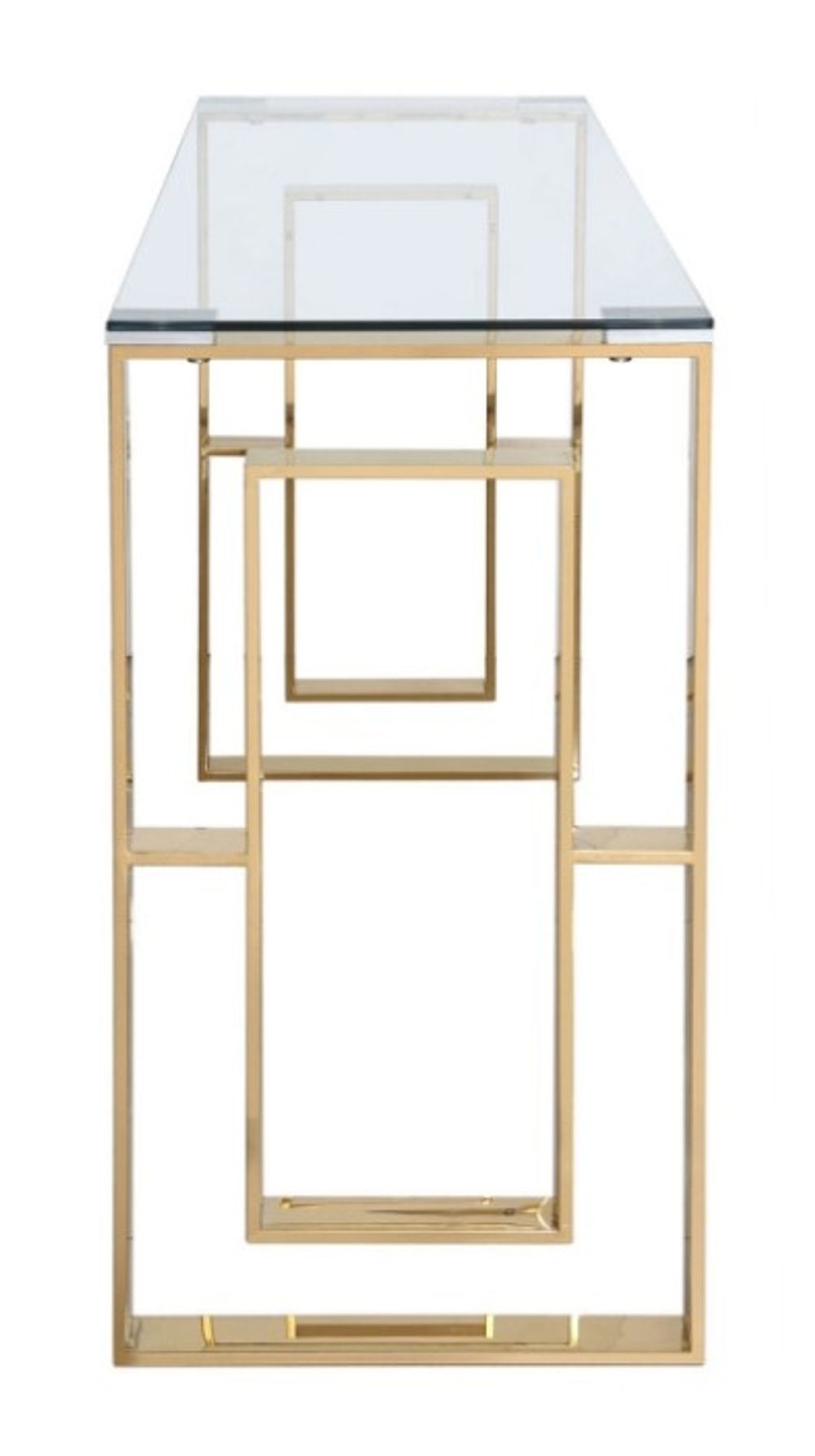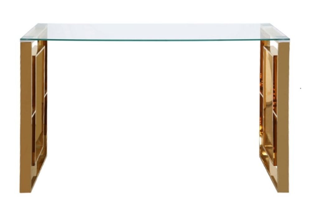 Item Code: MF126N-00-GLS-GD The simply stunning Apex console table will wonderfully complement classic and modern furniture, with its understated and stylish steel gold effect frame. The glass console table features a sleek glass tabletop, providing perfect entertainment space and also a fantastic option for any style of living room. Also perfect as a fabulous dressing table/ writing desk/workstation.