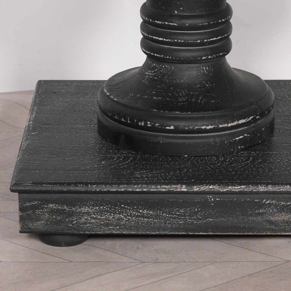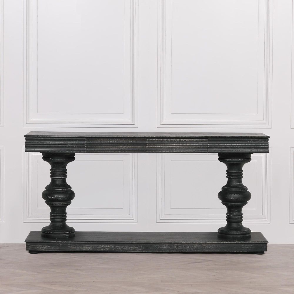 180cm Distressed Black Painted Wooden Console table handcrafted from mango wood with two drawers and hand-carved intricately detailed column legs.