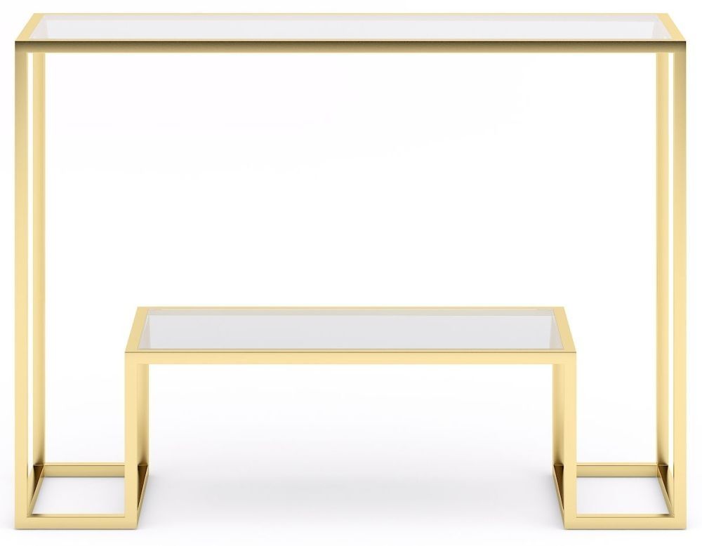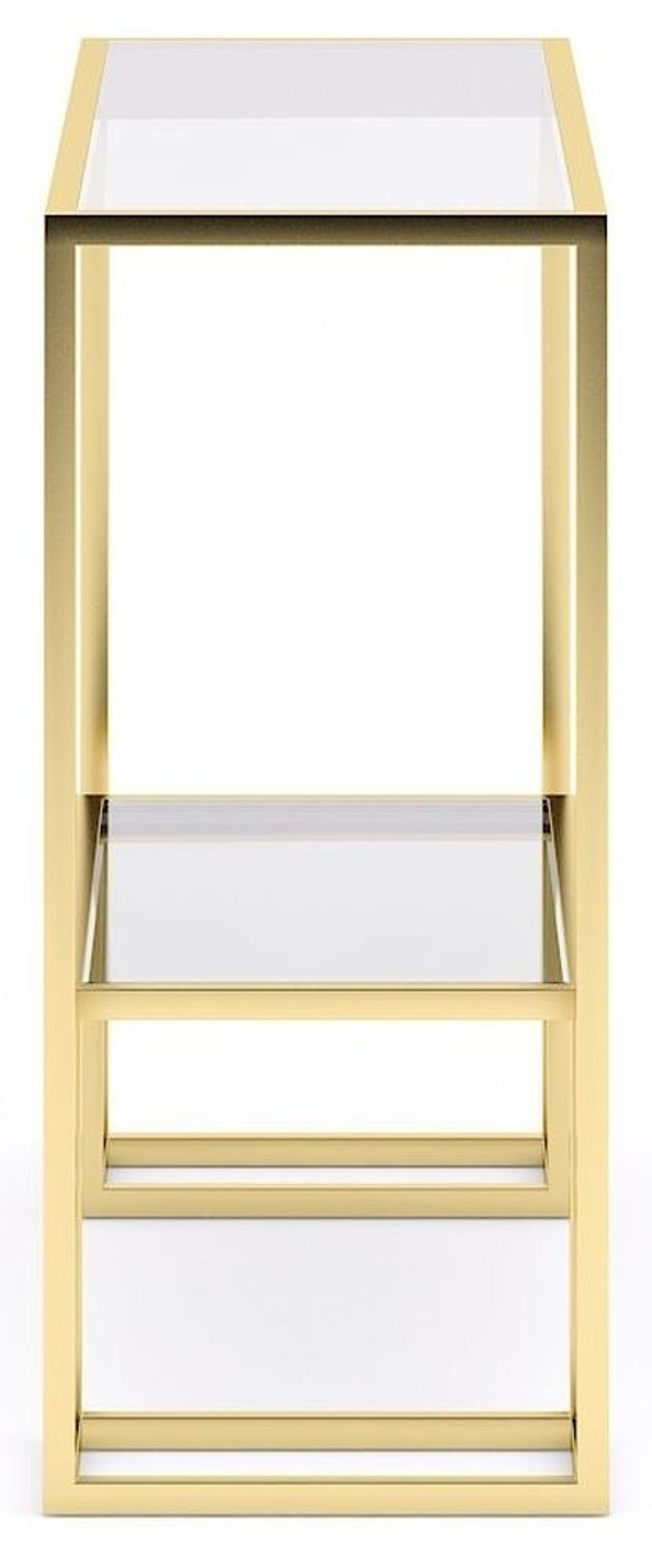 Item Code: AI-2367OTG This beautifully crafted console table is made from tempered glass and stainless steel with a chic gold finish. It features one shelf for handy storage and display. Place it in the hallway for a fabulous feature piece. Perfect for any modern home.