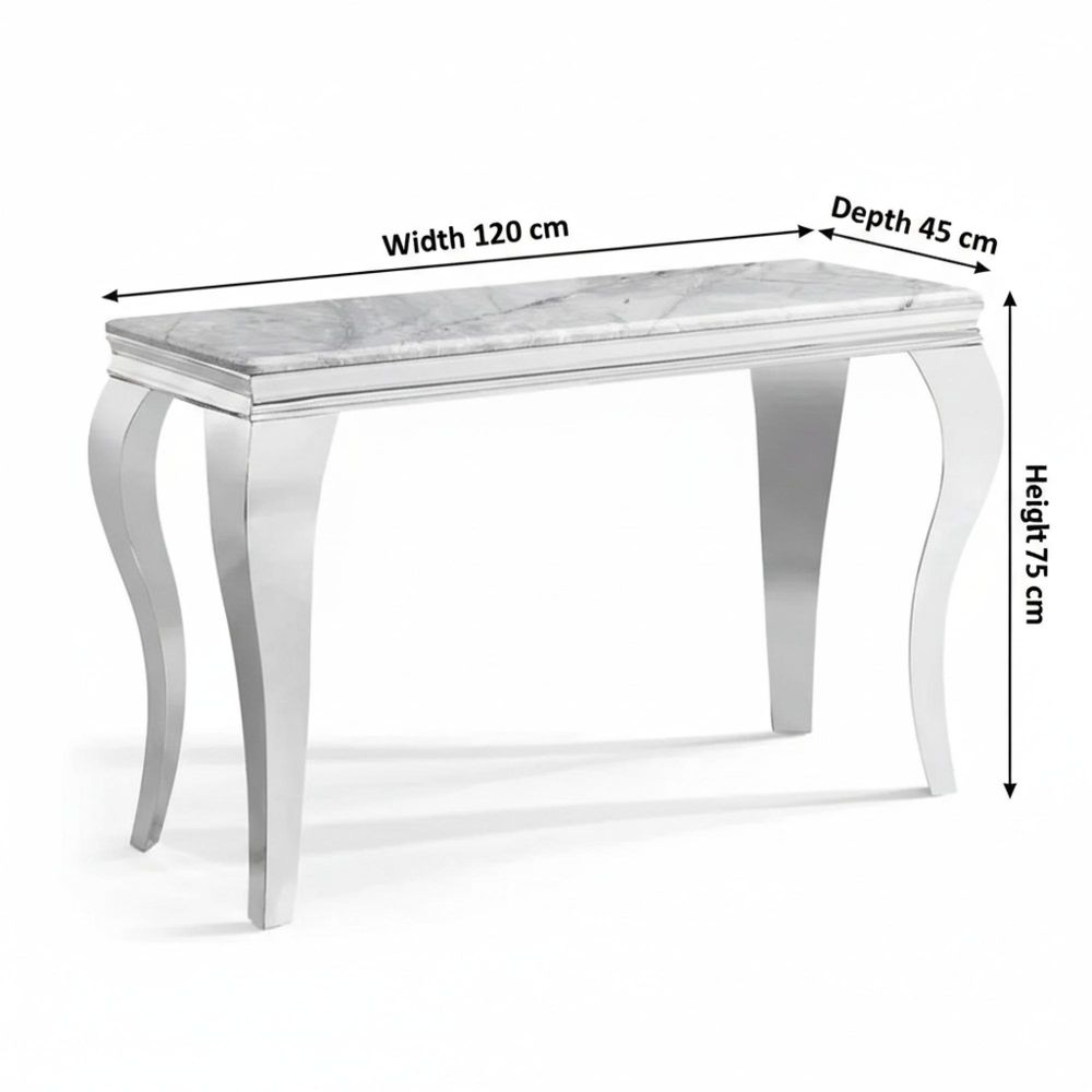 Make a dramatic statement in your hallway or living space with the Louis Grey Marble and Chrome Console Table. With its slim, elongated silhouette, this table delivers elegance without overpowering the room. The high gloss marble top and curved chrome legs make it the perfect backdrop for artwork, floral arrangements, or ambient lighting.