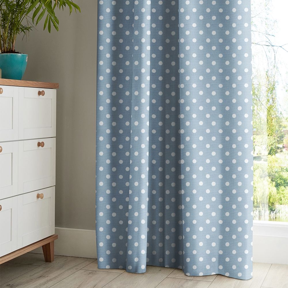 For a calm and serene feel, this pastel blue design features a white polka dot pattern for creating a relaxed sense of openness in your rooms.