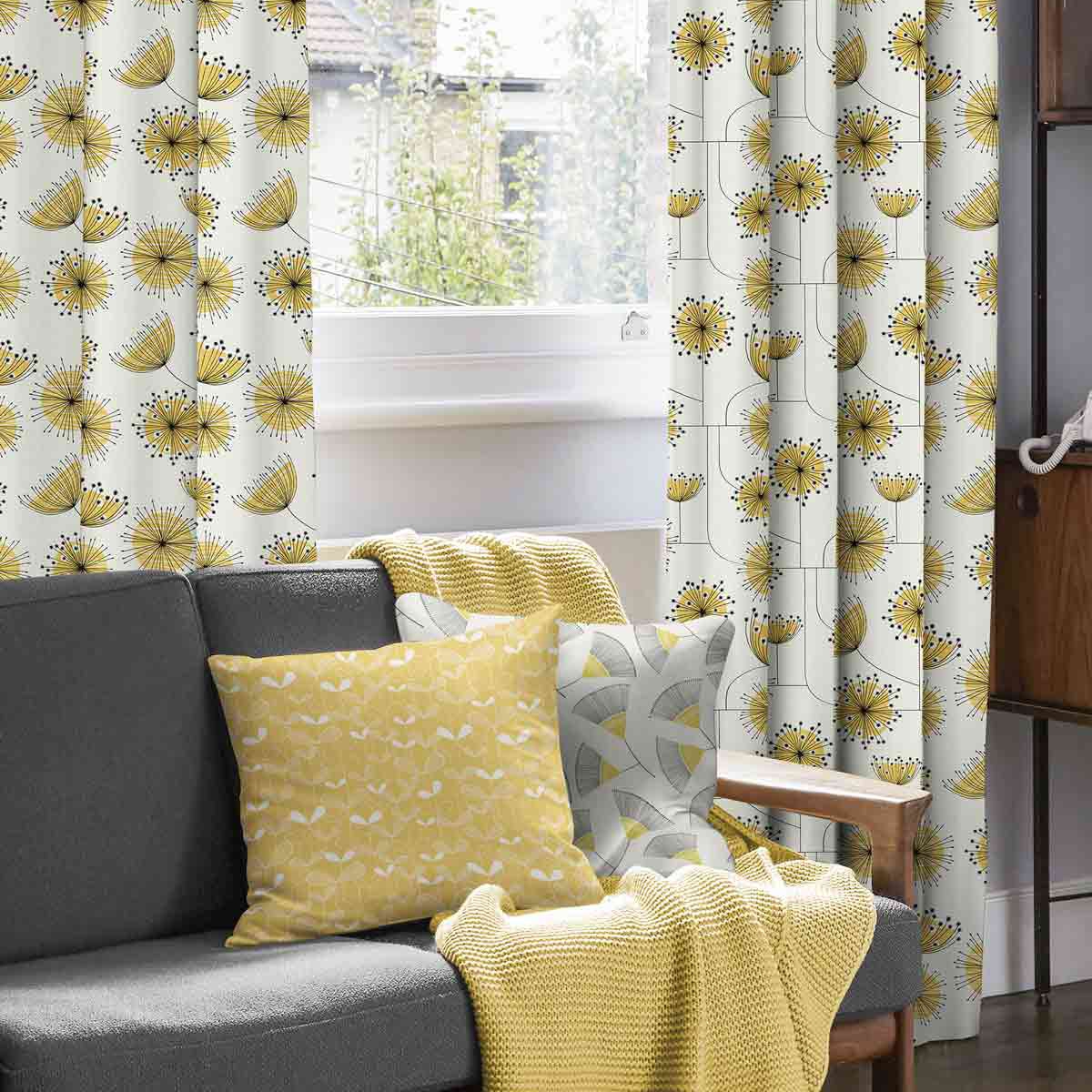 With its abstract illustrations of yellow dandelion flowers and linear patterning over a mono-white background, this contemporary design is perfect for adding a bright and friendly sense of style into any room.