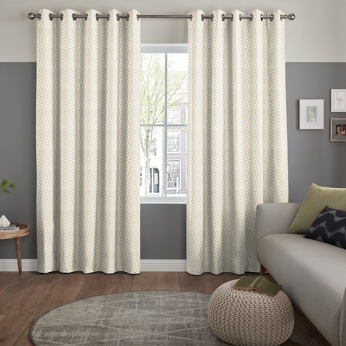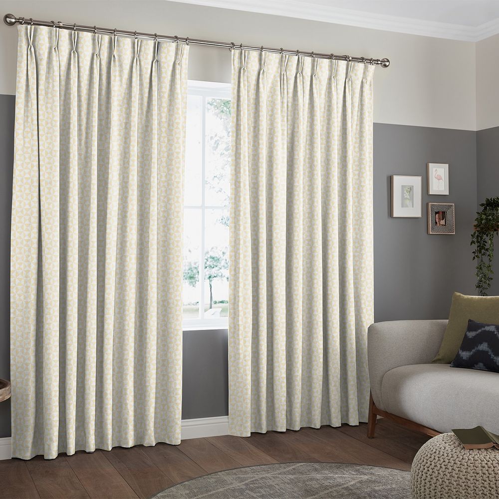 Item Code: ROMF-1465 Featuring a geometric pattern with contrasting line-shaded triangles of zest yellow and light grey, this abstract design is ideal for creating a cool and open space with its contemporary twist on a retro style.