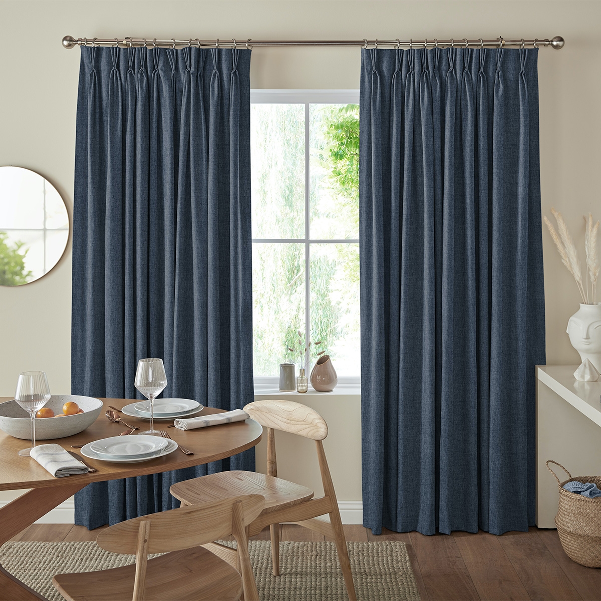 This 100% polyester fabric features a woven-style texture in a dark blue hue that can create a relaxed and serene energy to suit your rooms existing decor.