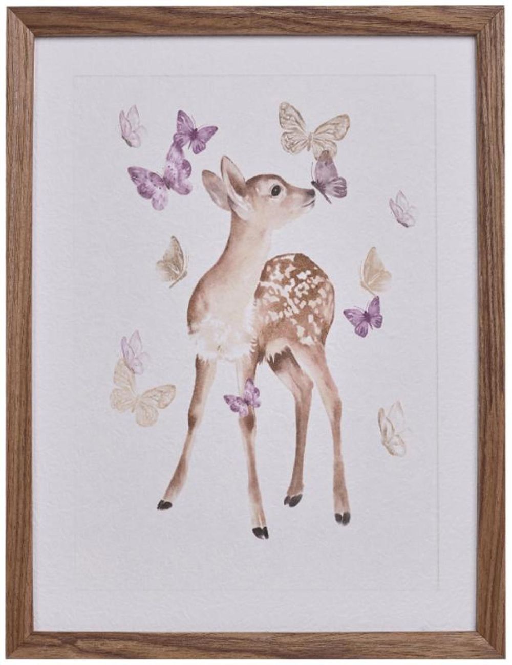 Two of nature's most beautiful creatures, the deer & butterfly. This wall art depicts a deer surround by majestical and colourful butterflies. A wonderful depiction of your very own little deer wandering around the garden. This wall art features a white inlay and a dark wood surround.