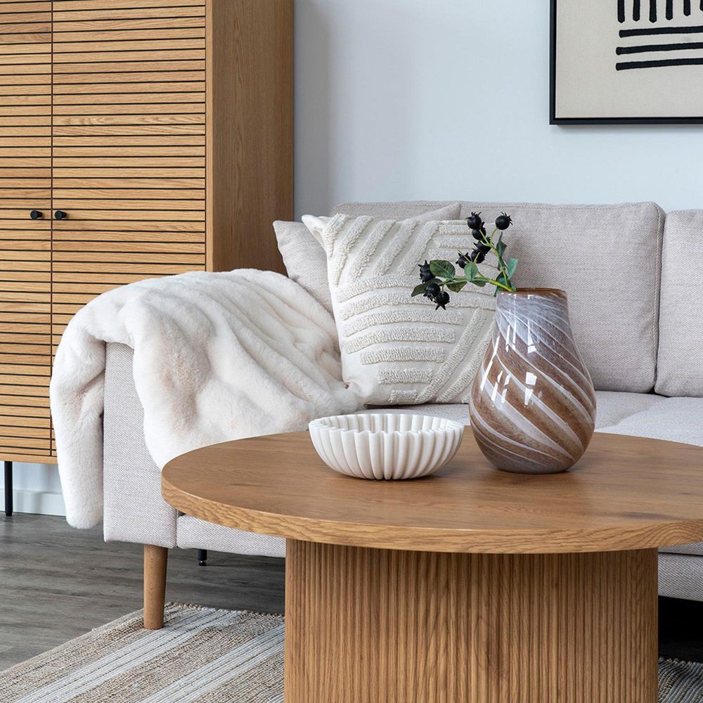 The warm brown tone complements natural textures such as wood, terracotta, and woven materials, allowing it to blend effortlessly into living rooms, dining areas, entryways, and bedroom surfaces. Each vase offers a unique swirling pattern, giving it character and showcasing the craftsmanship behind the piece. For those who appreciate artistry, quality, and subtle detail, this vase adds a polished touch to your interior.