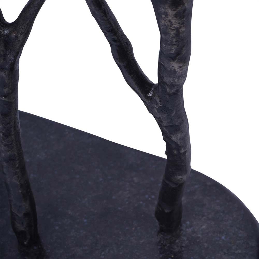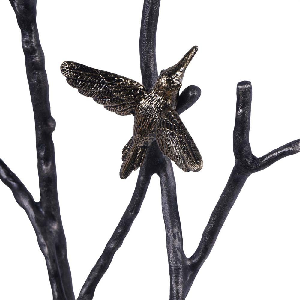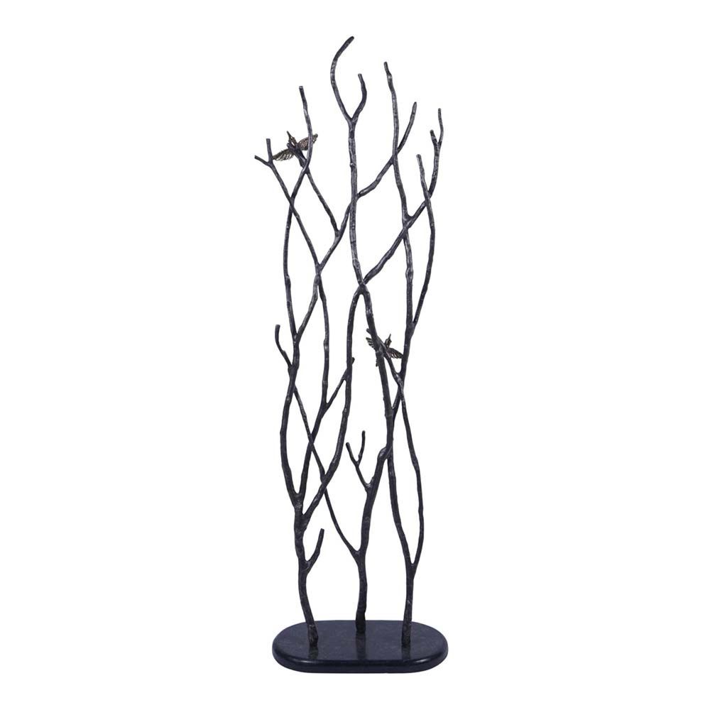 Item Code: 706234 This unusual decorative floor standing sculpture is handmade in aluminium a features branches and birds. Its heavy cast aluminium base features a dark charcoal finish and delicate branches with birds accented in an antique brass colour. This piece is meticulously crafted and unique, perfect for adding as a statement or screening feature. Standing on a sturdy cast aluminium base measuring 40cm x 20cm, the approximate screen dimensions are 102cm x 42cm. Each bird measures approximately 12cm x 12cm.