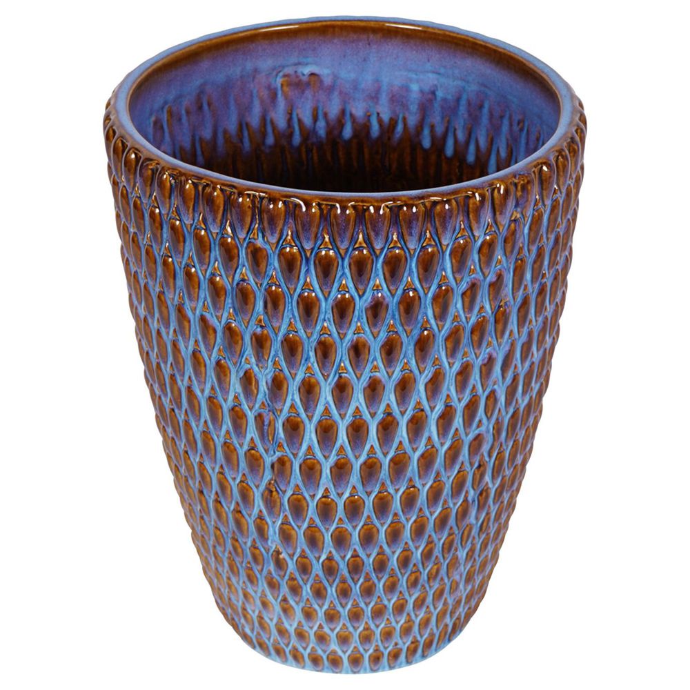 Introducing our Mediterranean Reactive Glaze Ceramic Planter in Blue. Elevate your indoor space with this captivating piece, featuring a reactive glaze reflecting azure blues, earthy browns, and subtle bronze hues. Designed with an exquisite raised teardrop surface, each curve embodies refined elegance. Perfect for showcasing botanical treasures, adding serenity to any interior. Indoor use only. Explore our full Mediterranean collection, including five additional Planters, three Ginger Jars, and three decorative Bowls.Free Delivery