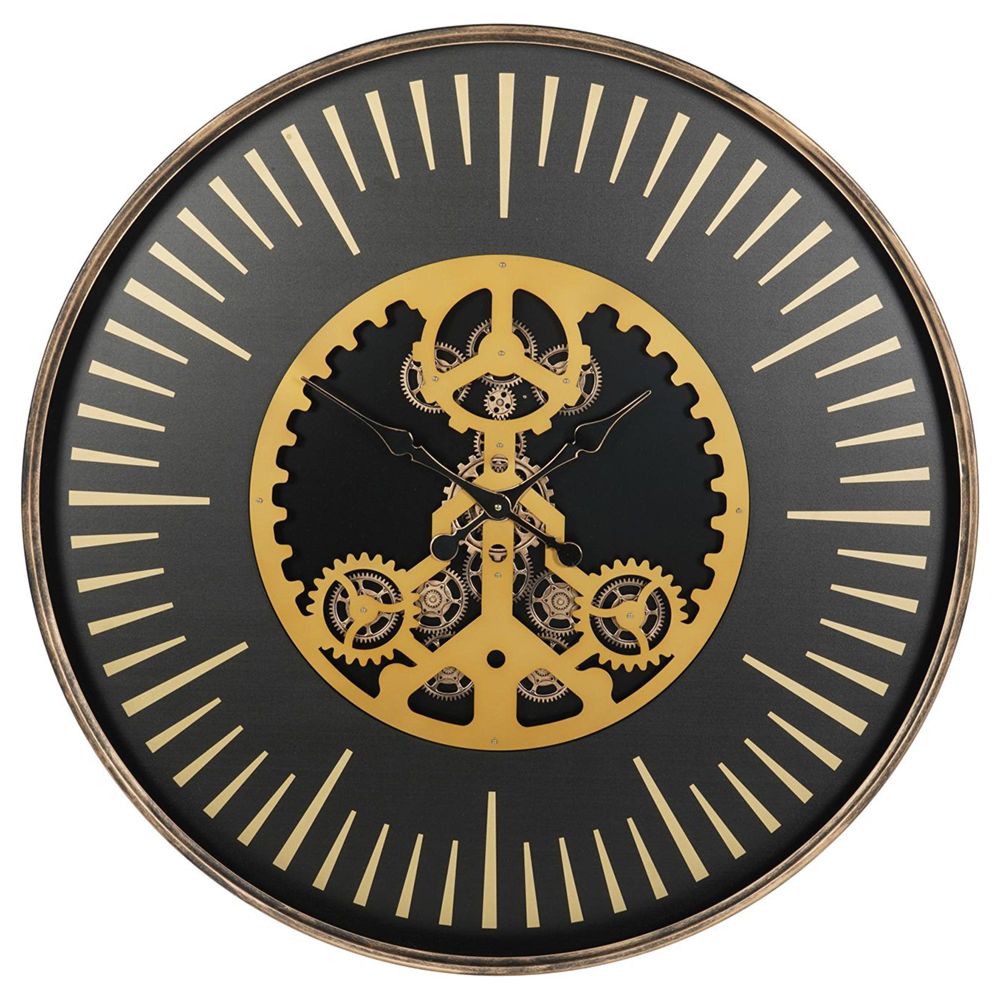 Introducing our Palladium Wall Clock with Centre Moving Cogs, a refined piece that redefines traditional timekeeping. Boasting a blend of black and gold hues, it exudes timeless sophistication. Its classic black hands navigate the intricately designed face, featuring moving gold cogs. Minimalist tick marks replace conventional numbers, adding a stylish touch. With its exposed open face, it commands attention and becomes a focal point in any room. Embrace the artistry of time with our Palladium Wall Clock, a versatile addition to any space. Mix and match with other Palladium items. For indoor use only. Dimensions: W100 x D8 x H100 cm. Batteries not included.Free Delivery