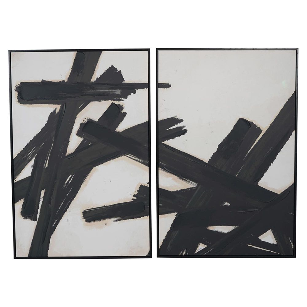 The Impasto Brushstrokes Set of 2 Canvas Prints comprises two framed canvases each featuring an array of bold black brushstroke marks, flowing from one to the next. Each brushstroke is then enhanced with a thicker layer of paint, applied by hand using traditional tools, leaving visible texture on the canvas surface. This painted technique was made popular by classic artists such as Van Gogh and Rembrandt, is called Impasto and is where this product gets its name. Each canvas measures 120cm x 80cm, both individually framed with a black wood effect frame. They hang portrait only, on two integral hooks. Wall fixtures not included.Free Delivery