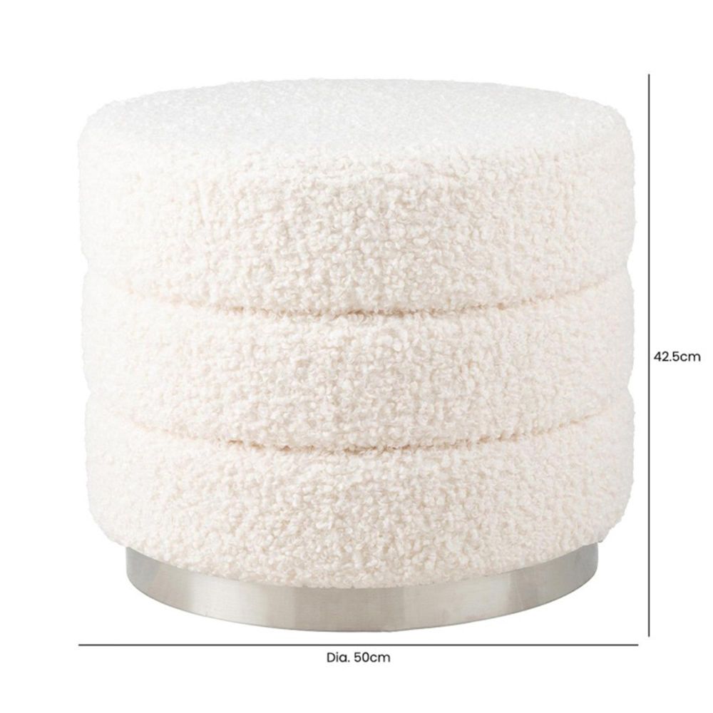 Item Code: FN157-00-WH A stylish and functional accent, or even in your entryway as a comfortable place to sit while you put on your shoes. With its combination of style and comfort, this white boucle round ottoman with a chrome base is a must-have piece for any home.Free Delivery