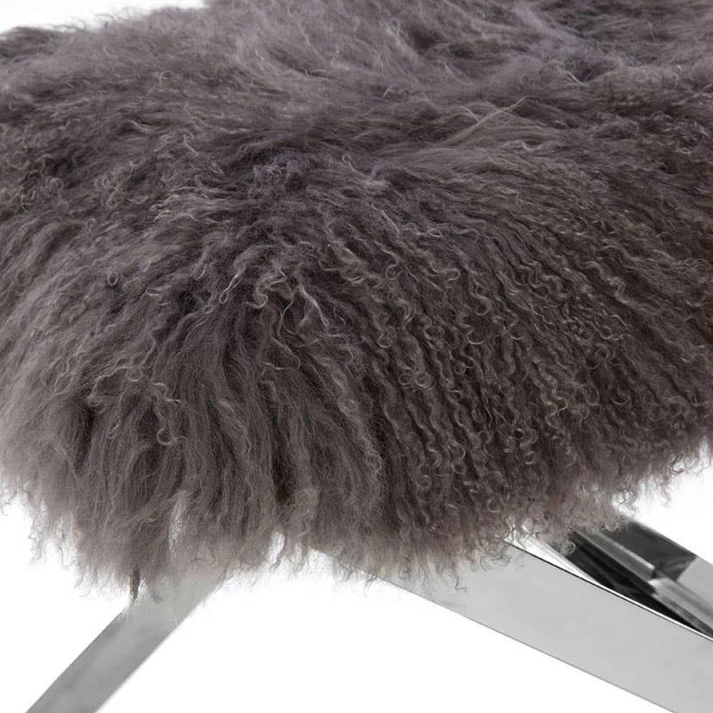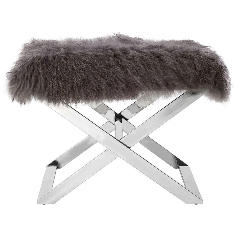 Item Code: 5502457 With its sheepskin upholstery and solid metal base in silver, this footstool adds a glam look to any interior.The seat is covered with grey sheepskin to complement the reflective silver finish of the crossed legs. It lends a touch of luxe style to the living room.