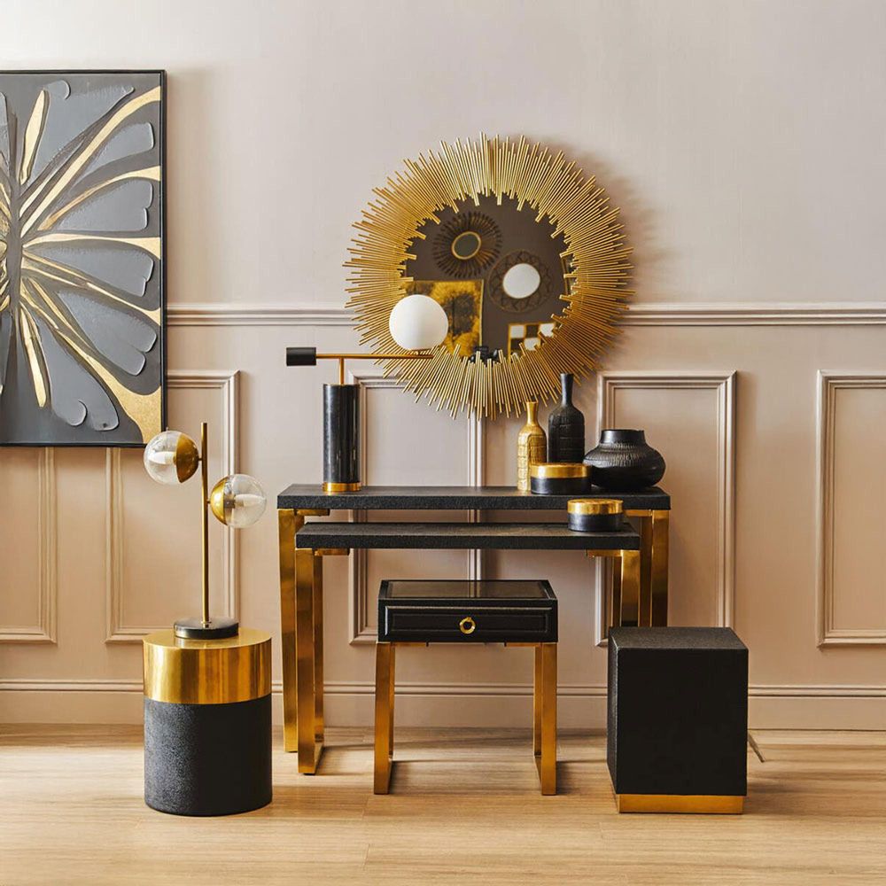 Item Code: 5528852 The Cardoba round side table and stool boasts a striking black shagreen effect base, while the top radiates a timeless charm with a gold finish. This round black stool features a minimalist yet luxe aesthetic with its granular black shagreen effect body and shiny gold finish top. The timeless combination of black and gold tones and contrasting surfaces makes for an instant focal point in the room. This versatile piece can be used as a table or stool.