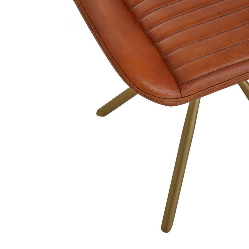 Item Code: 5529624 The Buffalo tan leather footstool has a modern aesthetic and a raised spoke gold finish iron base. This footstool has a genuine tan leather padded seat with channel detailing and elevated slanted sides. The seat is complemented and supported by a luxe gold finish iron spoke base.