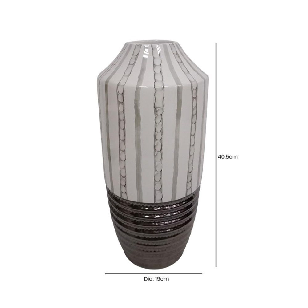 Item Code: SPVS383-L0-BRBZ This 40.5cm Light Brown and Textured Bronze Ceramic Vase features a warm light brown base with intricate textured bronze detailing, creating a stylish and contemporary decorative piece. Perfect for displaying fresh or dried flowers, or as a standalone ornament, it adds elegance and visual interest to any space. The durable ceramic construction ensures long-lasting beauty and functionality.Please note that the product color and finish may slightly vary from the images due to lighting and screen differences.Free Delivery