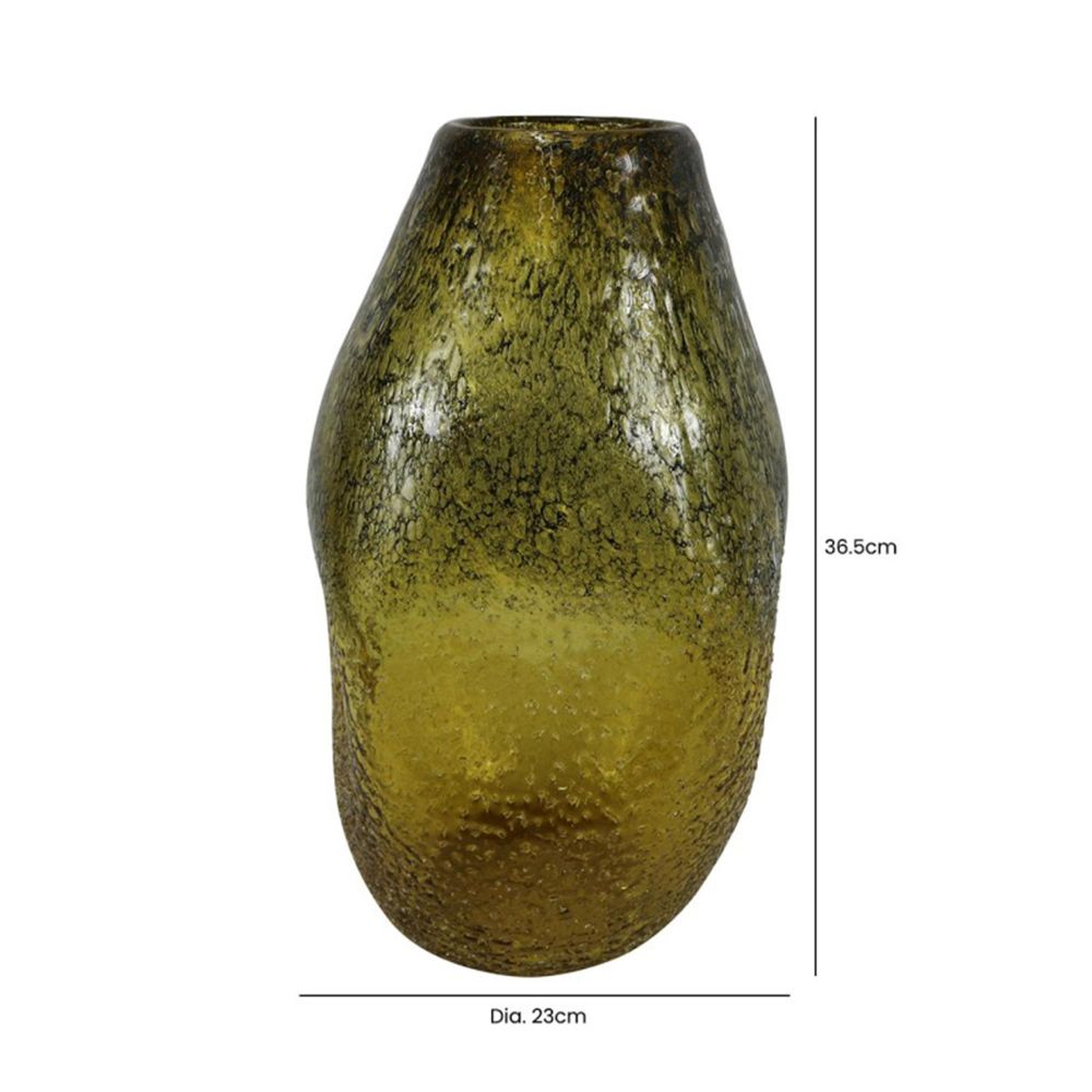 Item Code: SPVS397-L0-YE This 36.5cm Amber Yellow Handmade Glass Vase features a warm amber yellow hue with a handcrafted finish, creating a vibrant and artistic decorative piece. Perfect for displaying fresh or dried flowers, or as a standalone ornament, it brings a touch of brightness and elegance to any space. Each vase's handmade nature ensures a unique and one-of-a-kind finish.Please note that the product color and finish may slightly vary from the images due to lighting and screen differences.Free Delivery