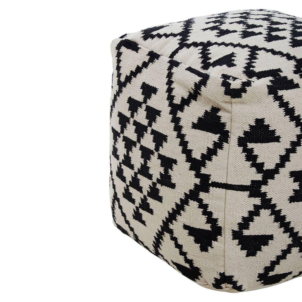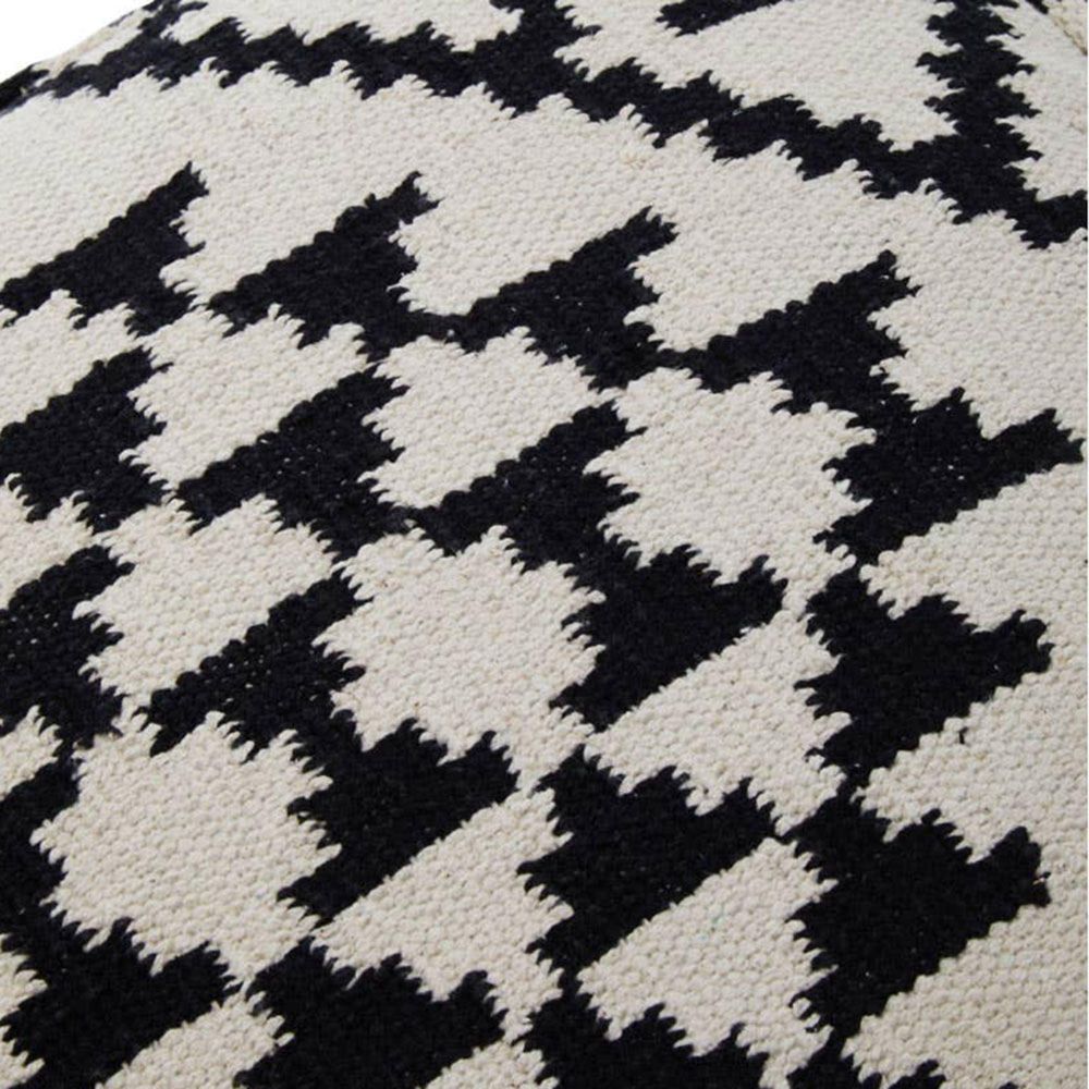 Item Code: 5529525 The Cefena black and white pouffe is a stylish and versatile accent piece that features kilim-inspired weaving, offering a monochromatic charm to the interior. Retrieving data. The pattern on this pouffe features geometric motifs and stepped designs, often found in Kilim weaving. The contrast between the black and white colours creates a visually striking pattern. Made from woven fabric, this pouffe boasts a variety of textures and is filled inside, providing comfortable seating or a footrest.