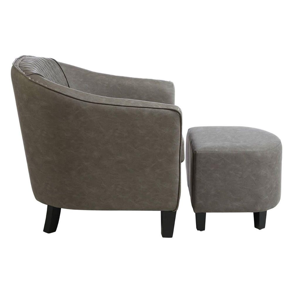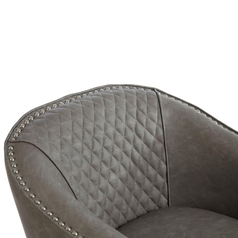 Item Code: 5501191 This comfortable grey faux leather tub chair with a diamond-quilted back and stud detailing, paired with a matching footstool.Silver finished studs around the chair add a cool metallic accent and accentuate the curved shape of the backrest. The backrest features quilted detailing lending a textured finish to the smooth faux leather.