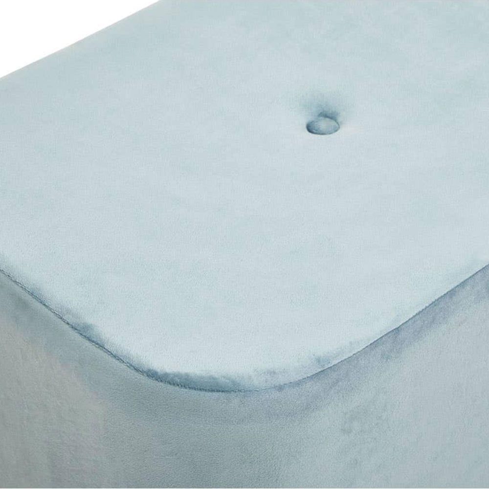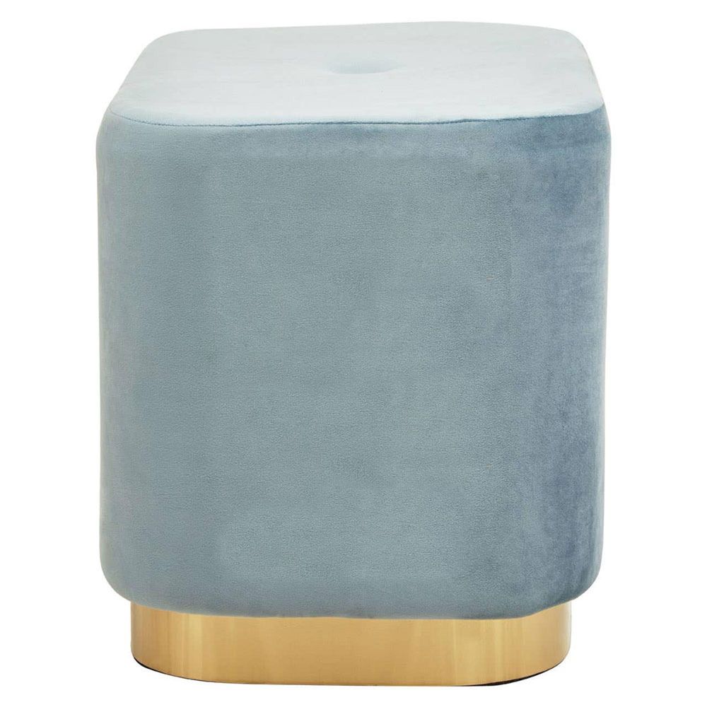 Item Code: 5528714 This rectangular pouffe, upholstered in blue velvet, rests on a sleek, matte gold base, creating a modern and elegant accent piece.The Hartford rectangular pouffe is upholstered in a soft blue velvet, offering a touch of subtle elegance. Its rounded edges and slightly pillowed top create a comfortable and inviting form. It is supported by a sleek, matte gold base, creating a modern and luxurious aesthetic. This accent piece offers the versatility of seating or a footrest.