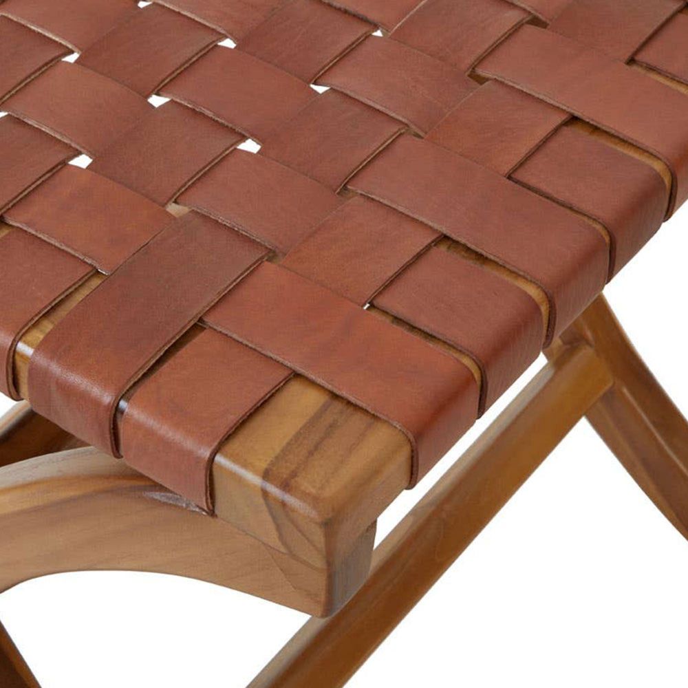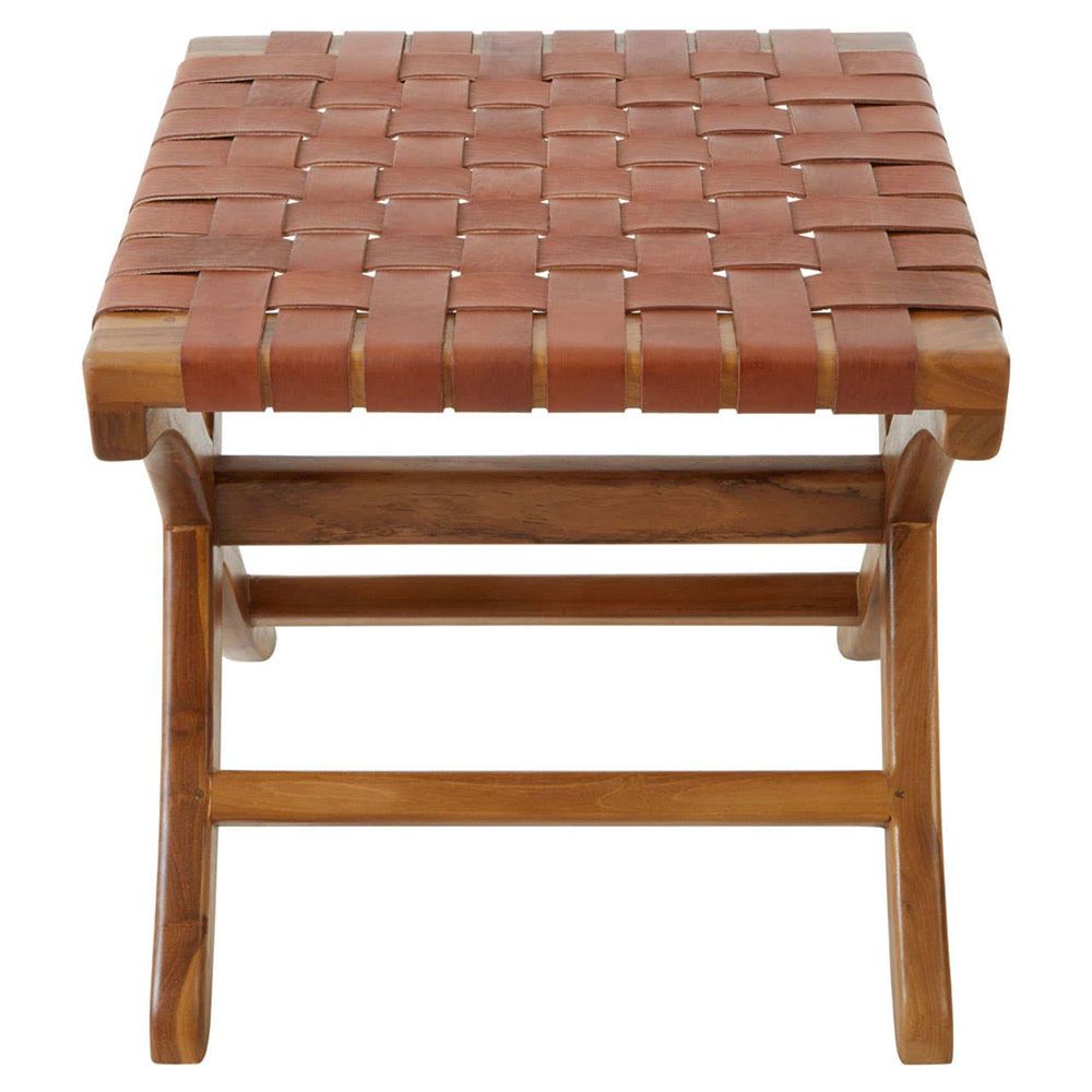 Item Code: 5527081 The Kendari brown leather lattice design stool with natural finish teak wood frame will add a boho vibe to your home.The Kendari low stool base is made from sustainable teak wood. The legs have a simple intersecting design and each one sports a slightly scrolled end that creates a subtle flourish. Leather straps are woven across the frame and are coloured brown to complement the teak wood, this stool will complement any living space in your home.