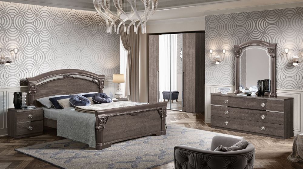 Item Code: 1032COM.00150 This bedroom with strong glamour accents is modernised by the clean, essential lines of the night table and dresser. The grey and silver striped 1.5 mm edging is the elegant detail on the 30 mm thick tops. The insert, which follows the arched line of the headboard, revives the nickel profile motif and enhances the shining look of the bedroom. The lacquered finish of the Nabucco headboard, footboard and mirror is the result of the high level of manual craftsmanship which reproduces the silver hues and charming chromatics of the birch finish.The special handles in a glossy silver finish emphasise the glamour of the Nabucco bedroom. The look is then softened and made contemporary by the grey and silver striped edging.This is a Made to Order itemAll Made to Order items are manufactured as per the order supplied by you.We are unable to accept cancellation or accept any extra cost that may incur due to wrong information provided by you at the time you placed the order.We will confirm all sizes/colours/finishes in written email (order confirmation) with you before going ahead with production of your order.
