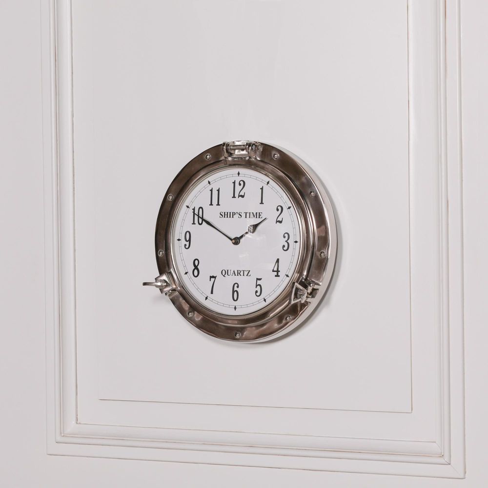 Porthole ship design wall clock crafted from polished aluminium with a glass front.