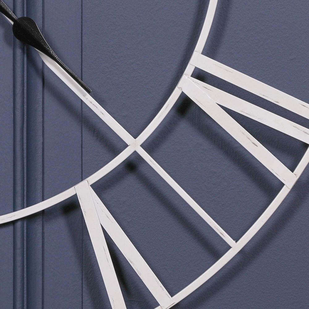 Twist-designed 110cm wall clock in a distressed off-white metal finish and contrasting black clock hands.