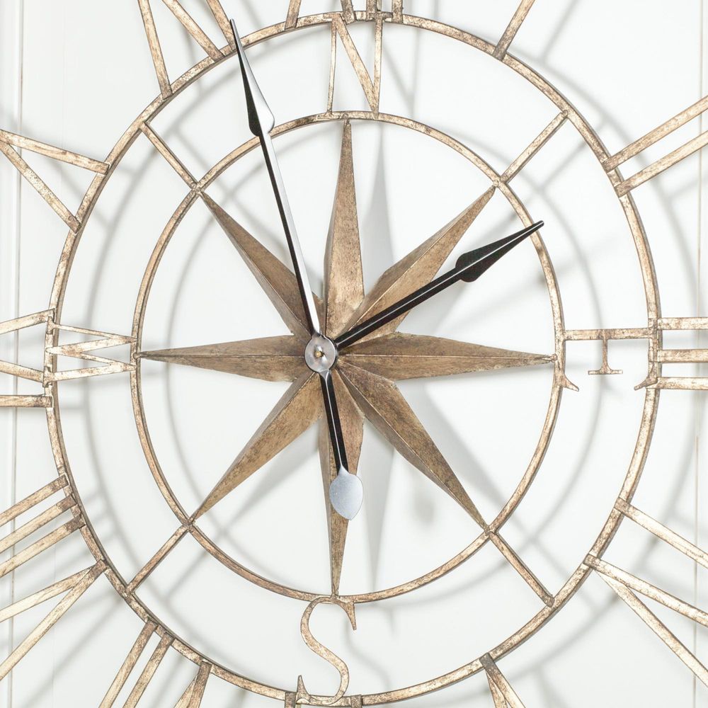 Extra-large 120cm wall clock in a vintage rustic metal finish featuring a compass design and Roman numerals.