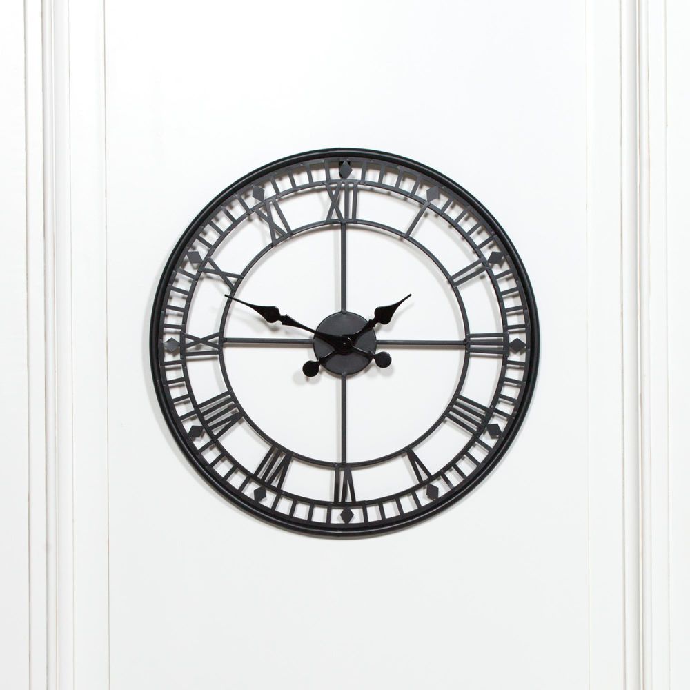 Item Code: CL221 55cm wall clock with an open black metal frame and Roman numerals.