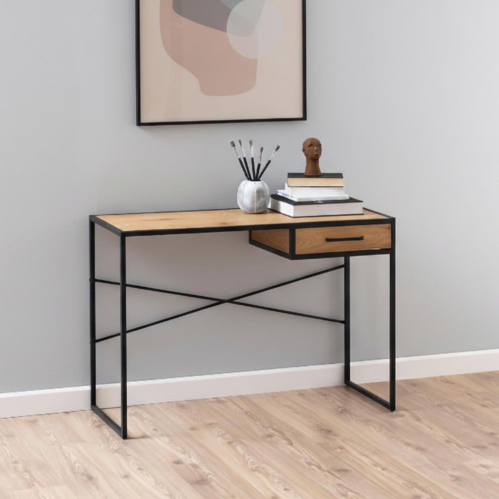 Item Code: 81316 This office desk is made with wood and metal for a modern industrial look. It has one drawer for convenient storage and a double pedestal design for added stability. The wild oak and black finish adds style and character to any workspace. It's the perfect choice for any home or office.