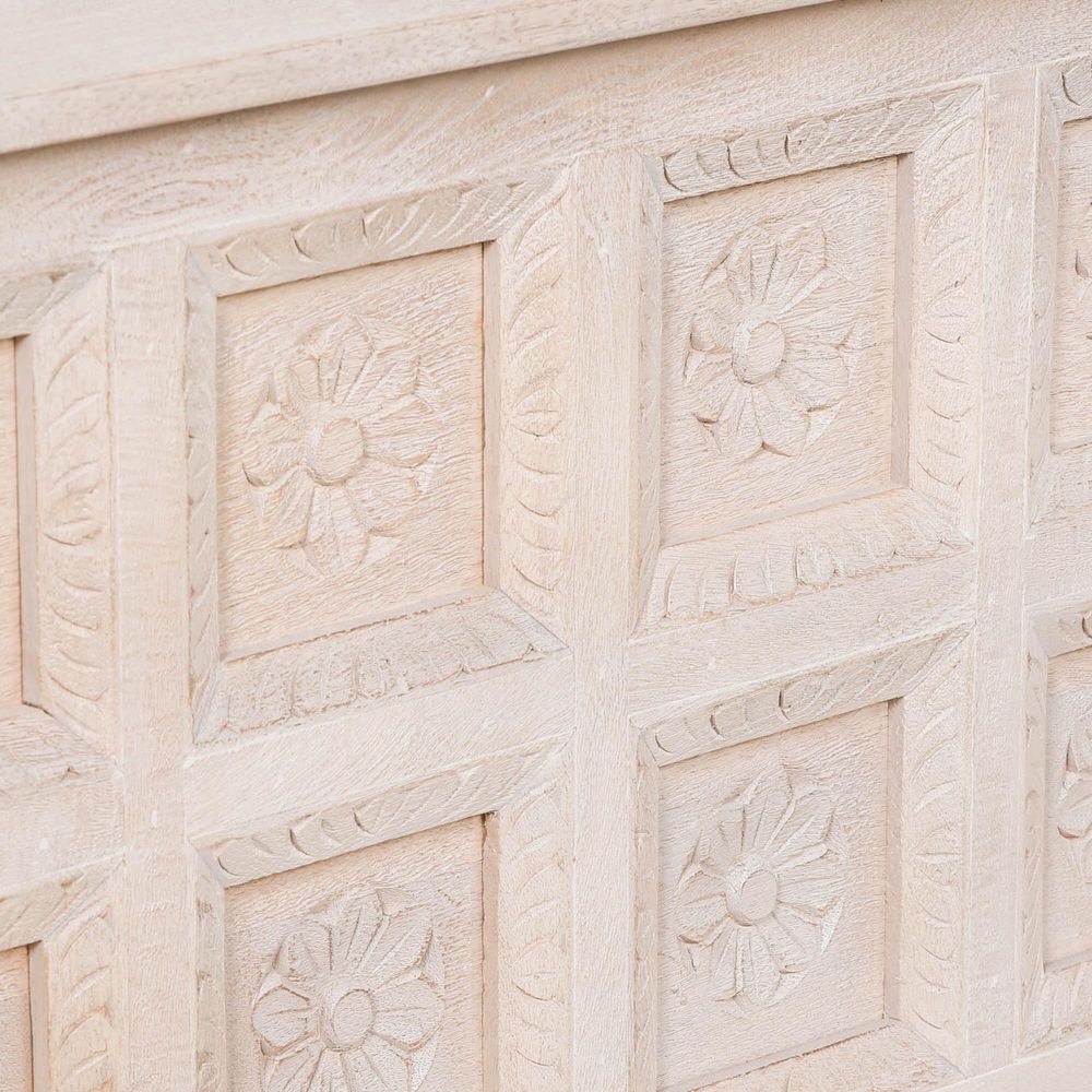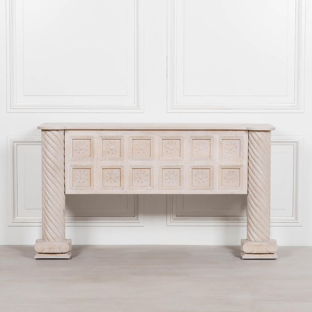 Item Code: KFA128 Blanchie finish wooden shop / reception desk ideal for interior, florist or shop display desk featuring delicate hand carved detailing and 2 storage compartments.