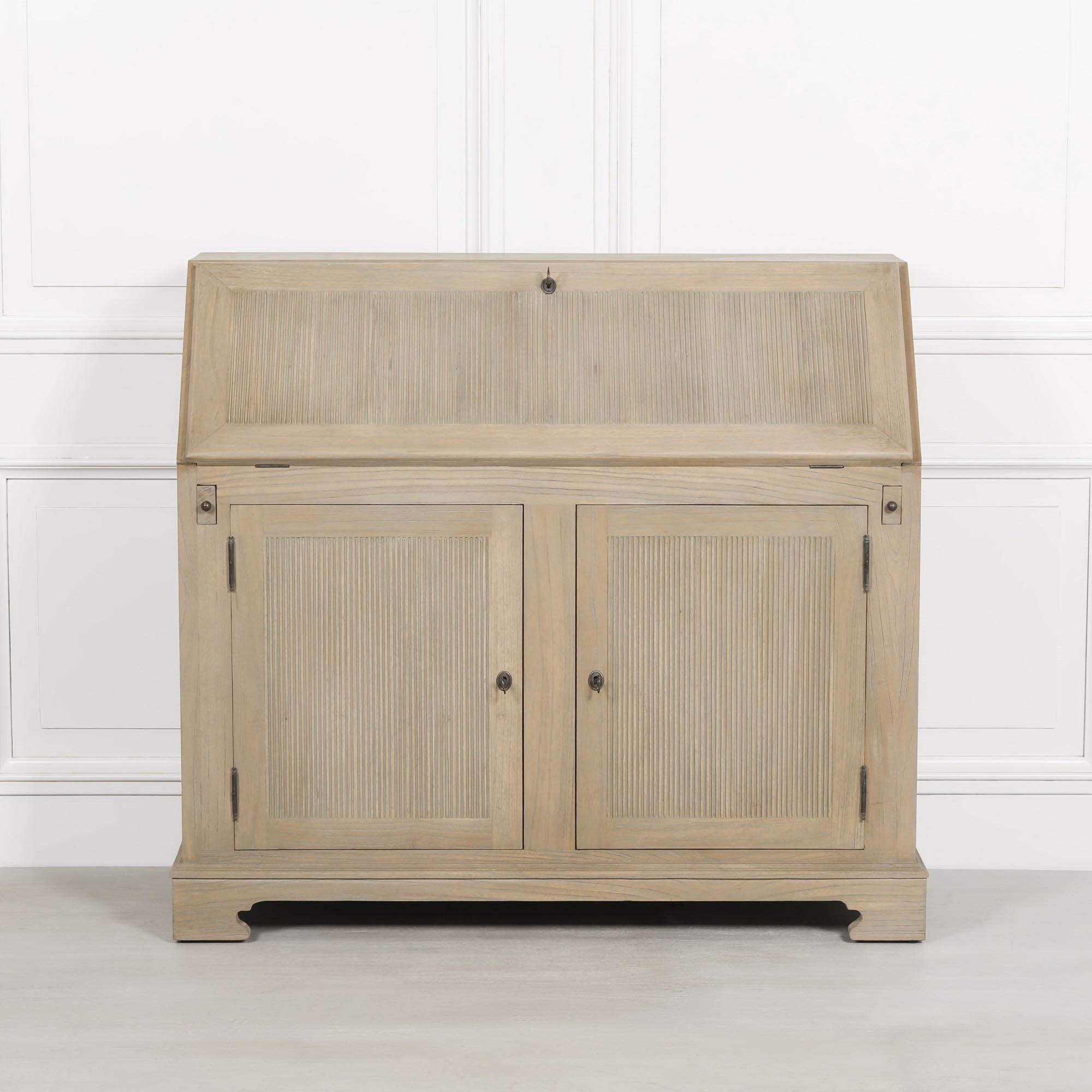 Item Code: TWD112 Wooden bureau desk handcrafted from white cedar in a rustic finish. Ideal for home working. Features 7 drawers, 2 lower storage cupboards with shelves and lockable compartments.max depth: 83.5cm.internal cupboard top shelf: H29.5 x W54.5 x D41.5cm.bottom shelf: H25.5 x W53 x D41.5cm.height under lowered hatch: 71.5cm.desk space: W108 x D52.5cm