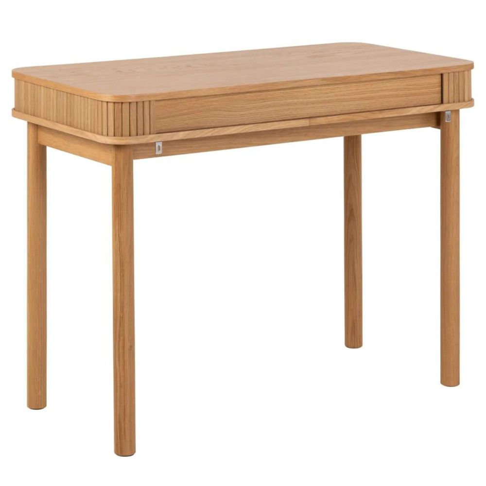 Item Code: 102749 Langley rectangular office desk, top oak PU lacquered veneer, 2 doors oak NC lacquered veneer, base NC lacquered oak with lamella front, sliding door and tambour door. Elevate your home office with this wooden desk. Crafted in a rectangular form with round corners, the desk blends modern and natural aesthetics catering to various interior styles. It is the slatted decor, round character and lacquered oak accents that define the desk's signature look. You can also keep your essentials inside the desk behind the tambour door. FSC certified.Free Delivery