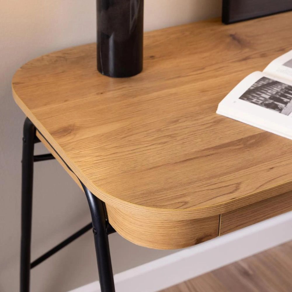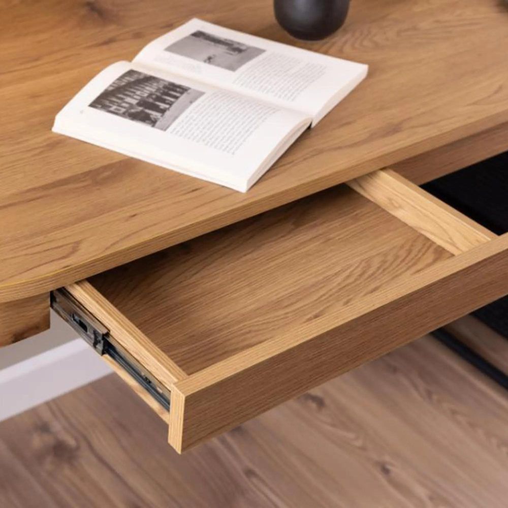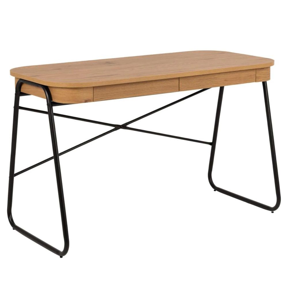 Item Code: 103752 Blueton rectangular office desk, top and 2 drawers matt wild oak rough paper, sledge base matt black rough powder coated steel. Made for a cosy and creative nook at home, this desk will easily become your go-to spot for sudden bursts of creativity. The wild oak look, rounded corners and a black tubular steel frame form an interactive design that exudes contemporary allure. Two drawers ensure your notebooks, pens and small essentials are safely stored.Free Delivery