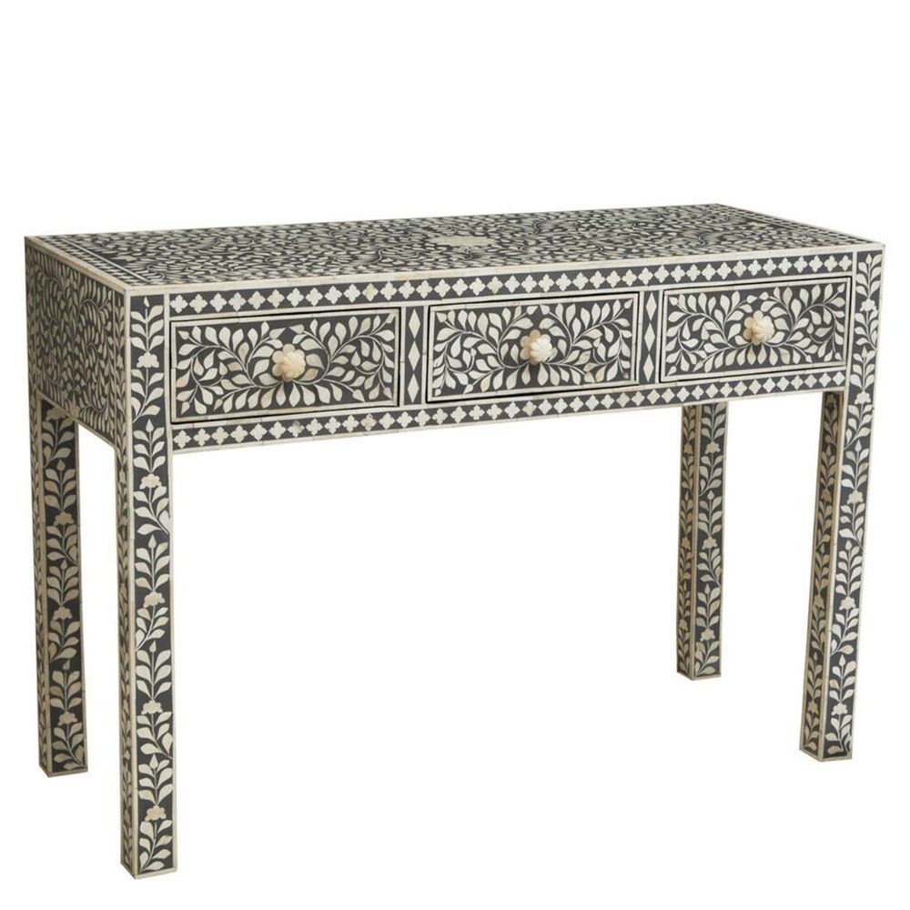 Item Code: 5529031 Decorated with white buffalo bone and contrasting grey finish, this desk will add a subtle feeling of elegance to boho or coastal decors.This traditional desk features hand laid white buffalo bone detail. Three drawers offer ample storage, each supported with a decorative carved floral drawer knob. The natural bone inlay form an elaborate floral pattern that lends a timeless aesthetic to the design.