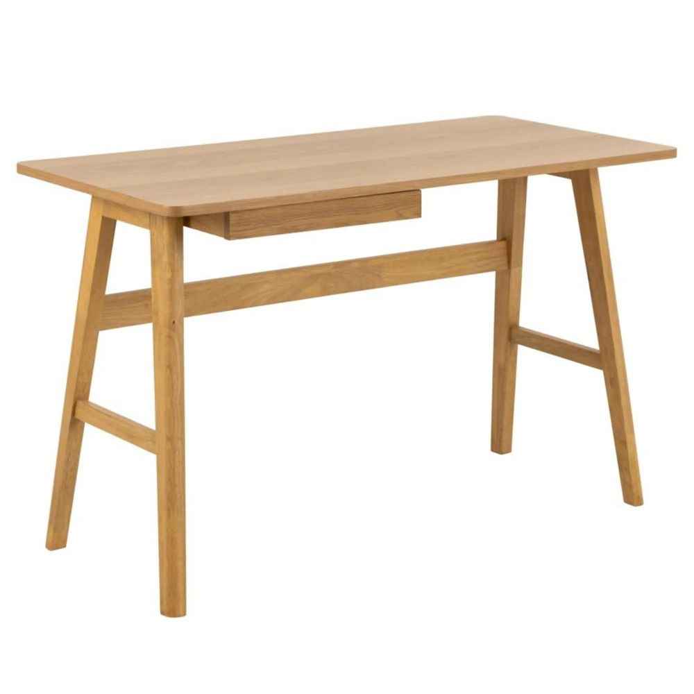 Item Code: 104886 Barnett rectangular office desk, top and drawer matt oak AC lacquered veneer, base matt oak stained AC lacquered rubberwood. Transform your workspace with this modern desk boasting an oak veneer top and a compact drawer that can be mounted on either the left or right side. With its sturdy oak-stained rubberwood base, this desk seamlessly blends style and practicality, making it ideal for a refined home office setting. FSC certified.Free Delivery