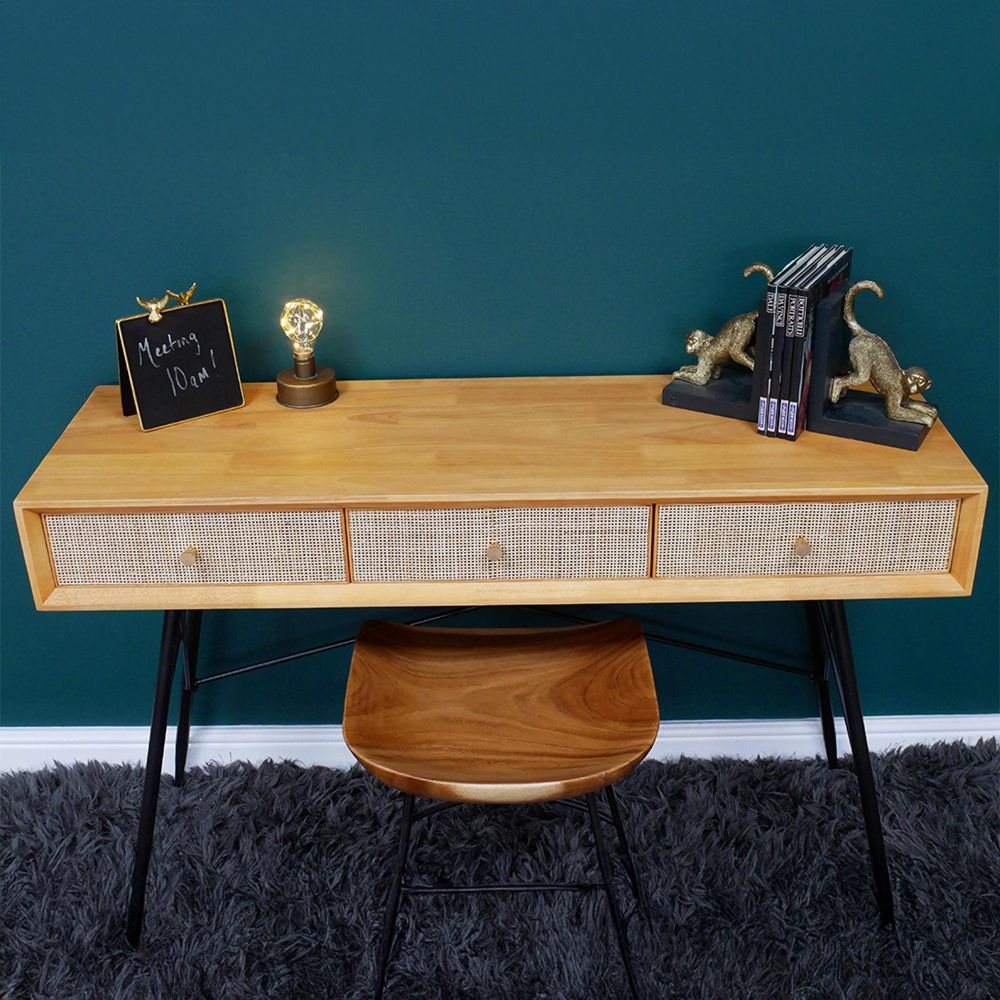 Desk - 3 Drawer - Rubber Wood and Rattan
